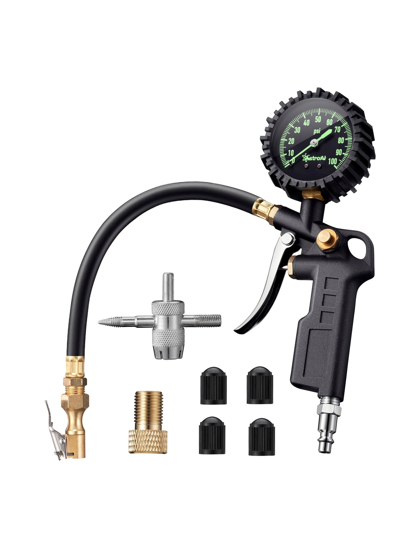 All-In-One 250Psi Tire Inflator Gauge The Astroai Digital Tire Inflator Gauge Makes Filling Tires Extremely Easy When Using An Air Compressor Instead Of Filling A Tire By Checking The Pressure, Adjusting, And Repeating Over And Over Again, Simply Press The Handle Of Tire Inflator Gauge Down To Fill The Tire To The Exact Pressure You Want And Then Release The Handle, It Will Stop Filling Save Your Time By Filling The Tire Only Once Comes With High Quality Stainless Steel Handle And Brass Air Chuck To Provide An Extremely Heavy Duty Inflator Gauge That Can Withstand Up To An Incredible 250 Psi The Rubber Hose Is Insulated And Extra Thick For Superior Performance Fill It Right The First Time The Astroai 100 Psi Tire Inflator Gauge Makes Filling Tires Extremely Easy When Using An Air Compressor Instead Of Filling A Tire, Checking The Pressure, Adjusting, Checking, And Repeating Over And Over Again, Simply Fill The Tire To The Exact Pressure You Want Fill A Tire To Specification Twice As Quickly Or Even Faster By Using Fewer Instruments Save Time And Just Fill It Right The First Time High Quality Construction The First Thing Youall Notice About This Gauge Is Its Weight High Quality Components Were Used To Provide An Extremely Heavy Duty Inflator Gauge That Can Easily Handle Up To 100 Psi The Rubber Hose Is Insulated And Extra Thick For Superior Performance Specifications Inflation Range: 10-100 Psi Accuracy: A1 Psi Measurement Units: Psi Compatibility: Aa Npt Connector Large 25 Glow Dial Heavy Duty Inflatable Chuck Compatibility: Npt Air Compressor Connector Package Contents 1 X Astroai Tire Inflator Gauge 1 X Aa Npt Quick Connect Fitting 1 X Valve Caps 1 X Valve Core T