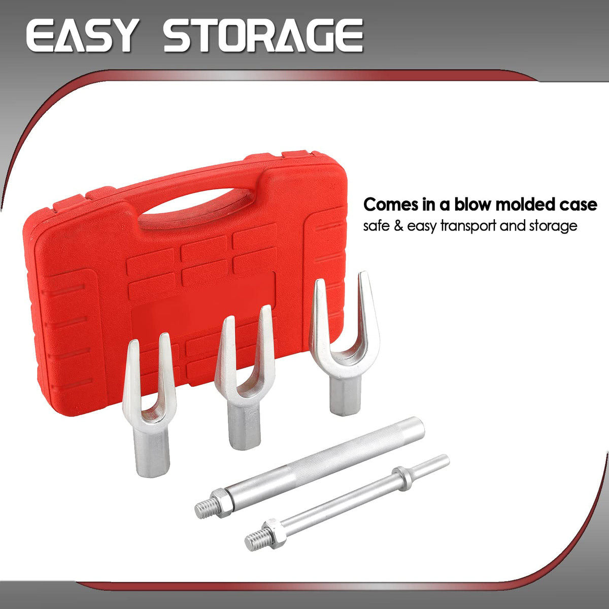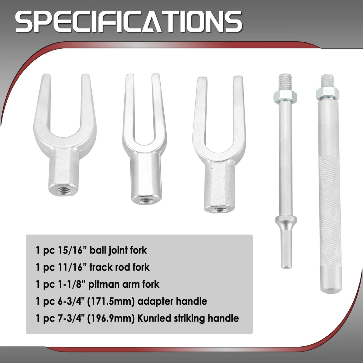 Atp 5Pcs Ball Joint, Tie Rod, And Pitman Arm Great For Separating Ball Joints, Tie Rods, And Pitman Arms Durable: Constructed From Chrome Vanadium Steel For Strength And Longevity All Forks Are Interchangeable And Kit Comes In A Durable Case For Convenient Storage Tie Rod Spreader With 1116 Wedge Opening Ball Joint Separator With 1516 Jaw Opening Pitman Arm Wedge With 1-18 Opening 7 A Inch Knurled Striking Handle Is Included For Use With Conventional Hammers 6 A Adapter Handle For Use With Air Hammer Package Includes: 1 X Tie Rod Spreader With 1116A (175Mm) Wedge Opening 1 X Ball Joint Separator With 1516A (238Mm) Jaw Opening, 1 X Pitman Arm Wedge With 1-18A (286Mm) Opening, 1 X 7-34 (1969Mm) Kunrled Striking Handle For Use With Conventional Hammers, 1 X 6-34 (1715Mm) Adapter Handle For Use With Air Hammer, 1 X Carrying Case