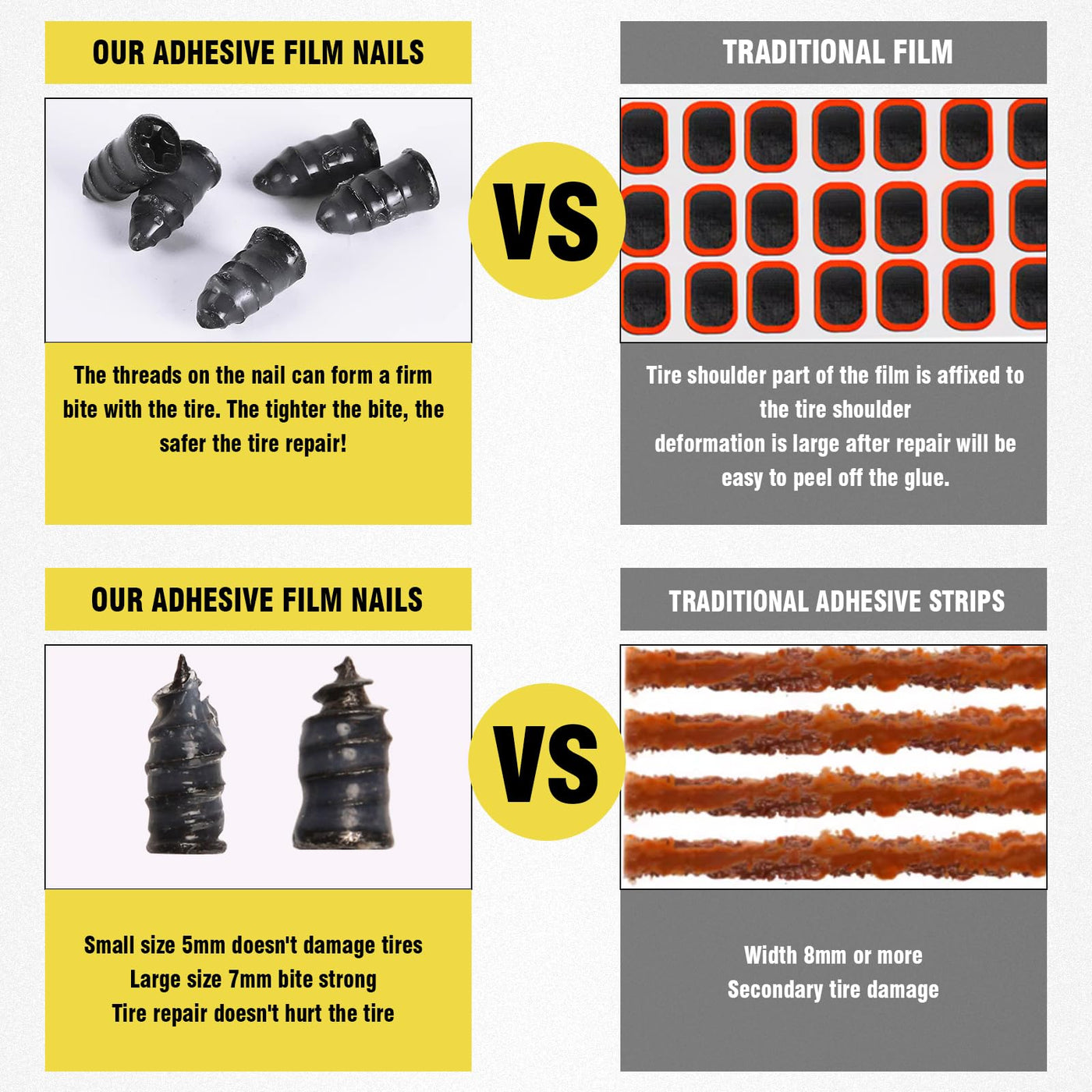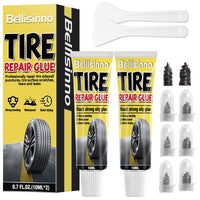 Bellisinno tire repair glue offers professional-grade solutions, ensuring fast and long-lasting tire repairs. TWO SIZES OF NAIS: The flexible plastic screw is covered with sticky seal. If the tire is pierced by a steel nail and leaves a hole, the tire glue nail can be used with glue. Small tail design prevents secondary damage. Thicker center threads increase bite with tires. INSTRUCTIONS: 1.Clean the surface before use. 2.Select tire repair nails of appropriate diameter. Apply tire glue to the puncture, screw in the tire repair nail, tighten it, and apply more tire repair glue on the surface to strengthen. 3.Use a scraper to smooth the rubber glue for tires evenly. Wait for the tire patch glue to solidify; surface drying time is 3-30 minutes, and curing time is 12-24 hours. 4.If the tire is leaking, inflate it to the recommended pressure. NOTICE: Wait for the tire cement to completely dry and cure before using your vehicle. Avoid using too much tire sidewall repair glue as this may result in a loose bond or unbalanced tire after repair. Keep out of reach of children. Store in a cool, dry place. Avoid contact with skin and eyes. In case of contact with eyes, rinse with plenty of water and seek medical attention immediately.