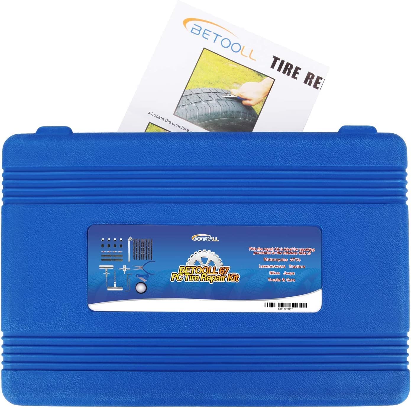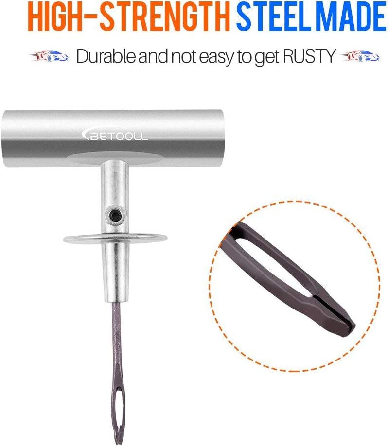 Q: What types of vehicles can the BETOOLL Tire Repair Kit be used on?A: The BETOOLL Tire Repair Kit is versatile and can be used on a wide range of vehicles including cars, motorcycles, SUVs, trucks, RVs, trailers, tractors, and lawn mowers. It is designed to repair almost all tubeless tires.