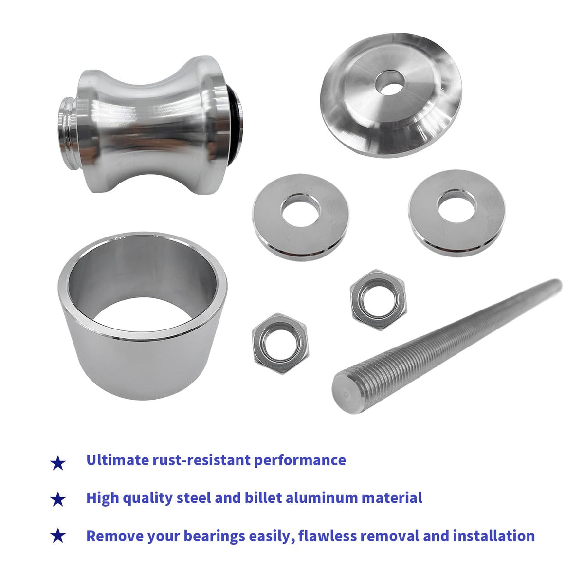 Q: What materials are used in the construction of this removal tool?A: The BIGLKNM Wheel Bearing Removal Tool is crafted from solid steel and billet aluminum, ensuring it is sturdy, resistant to rust, and durable for long-lasting use.
