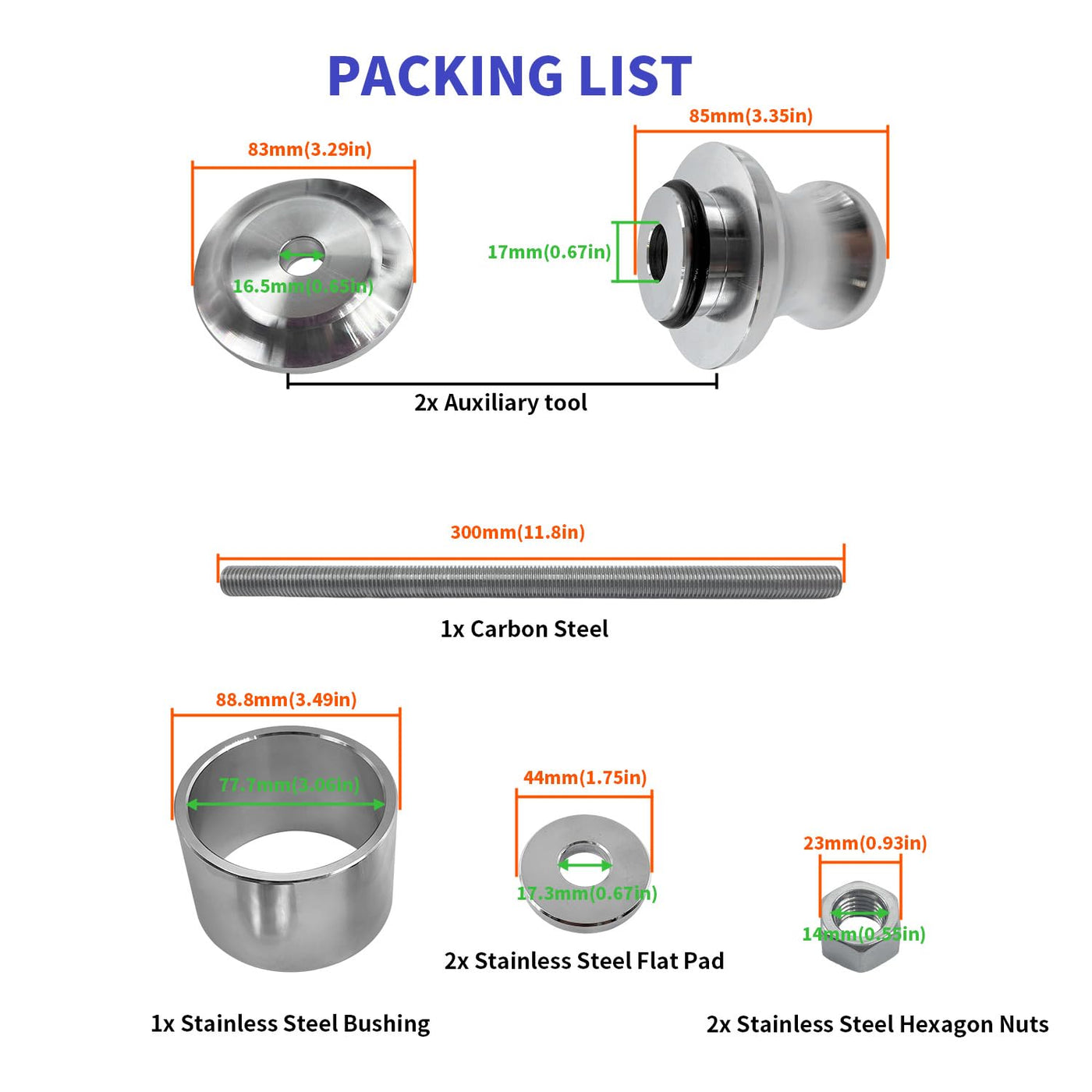Q: Does this tool come with any additional components?A: Yes, the tool kit includes essential components such as 2 auxiliary tools, a sealing ring, a toothpick level carbon steel tool, a stainless steel bushing, 2 stainless steel flat pads, and 2 stainless steel hexagon nuts, providing everything you need for the bearing replacement.