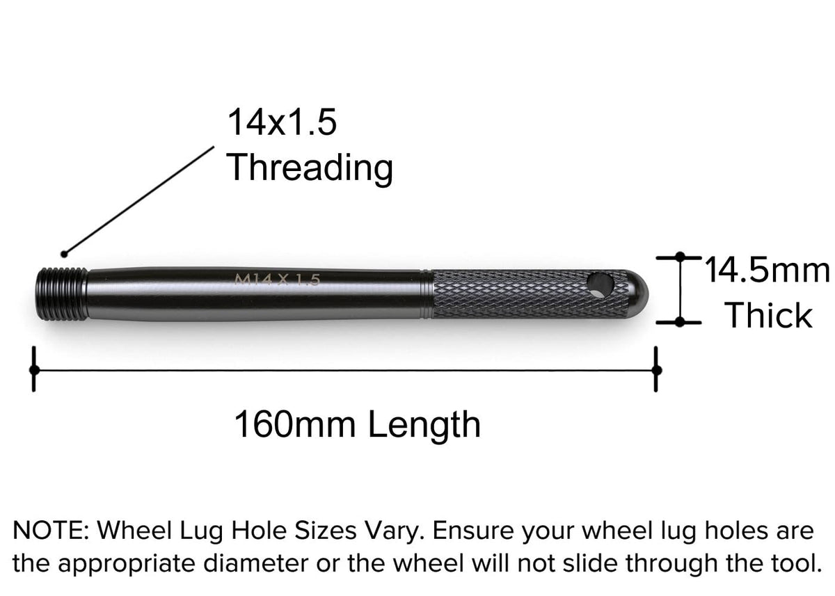 Q: What should I check before purchasing this wheel alignment tool?A: Before purchasing the Black Wheel Hanger Alignment Pin Guide Tool, verify that your vehicle's hub has a 14x1.5 thread size for compatibility. Additionally, ensure that your wheel's lug holes are larger than 14.5mm in diameter to guarantee a proper fit.