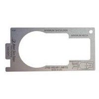 Q: How do I use the king pin gauge to check for wear?A: To check for wear, slide the round opening of the gauge over the king pin to the 'neck' area. If it fits around the neck at the minimum area, the king pin is worn beyond serviceable limits.