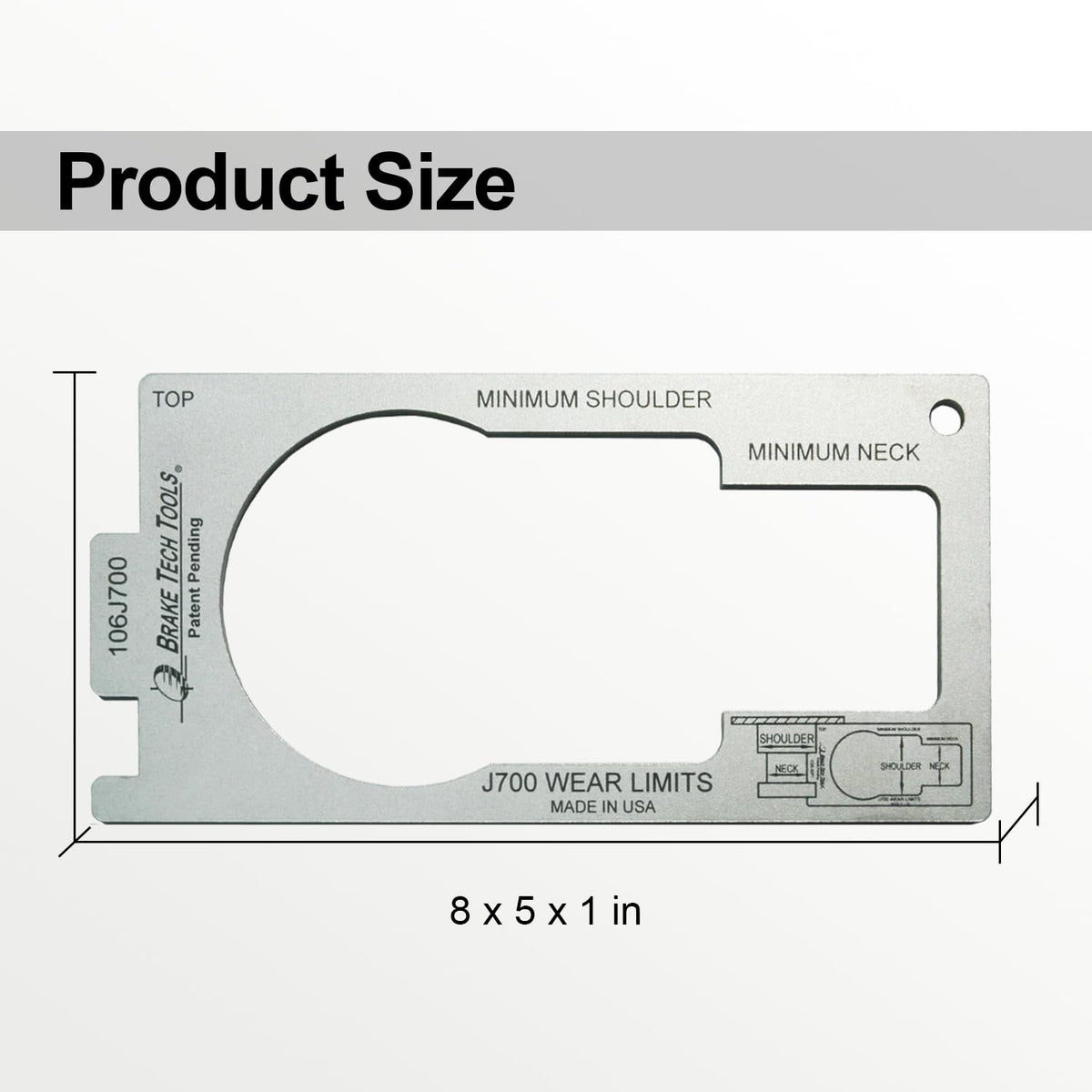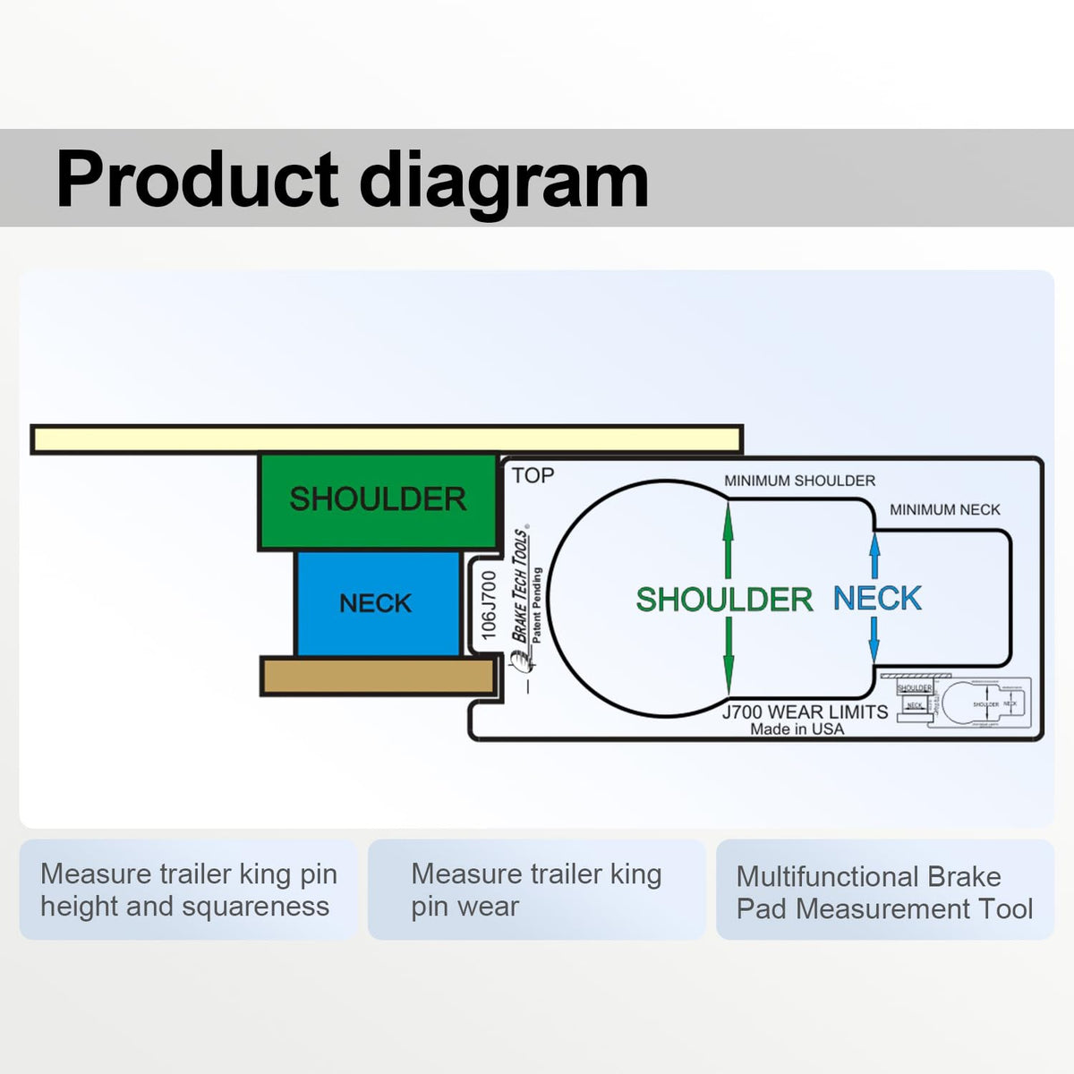 Q: What is the purpose of the Brake Tech Tools Fifth Wheel King Pin Gauge?A: The Brake Tech Tools Fifth Wheel King Pin Gauge is designed to measure the wear, height, and squareness of trailer king pins, ensuring they meet serviceable limits according to the SEA J700 standard.
