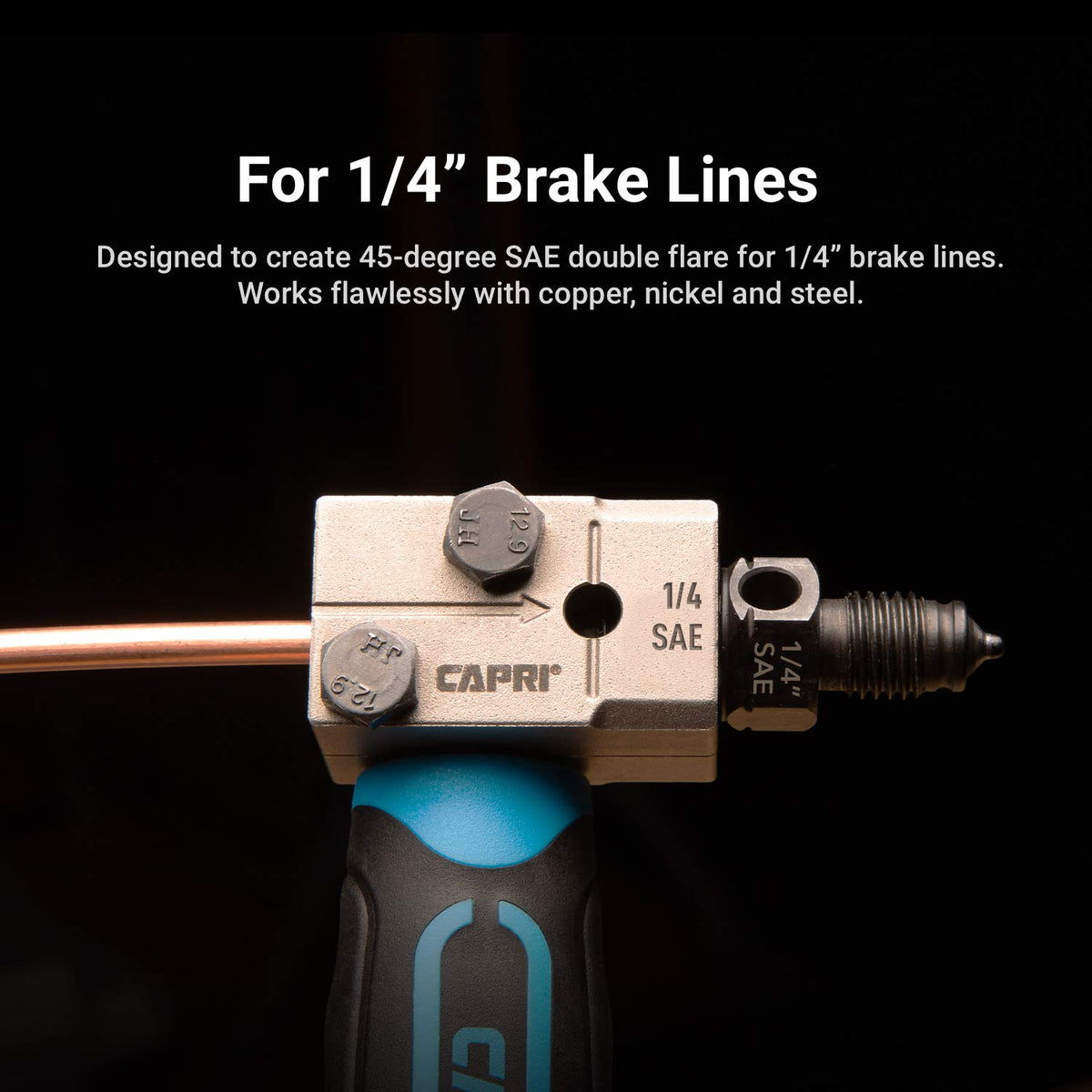 The Capri Tools Double Flaring Tool Lets You Create Perfect 45-Degree Sae Double Flares In Half The Time Compared To Old Generation Flaring Tools. Its Compact And Portable Design Lets You Work Both Off Vehicle And On Vehicle, Even In Tight Spots. The Die Can Be Detached So You Can Also Work With A Bench Vise For More Grip. The Tool Works Flawlessly With 1/4 In. Steel, Nickel, And Copper Tubing. This Is An All-In-One Tool. A 10 Mm And A 17 Mm Wrenches Are The Only Other Tools You Need To Start Making Perfect Double Flares.