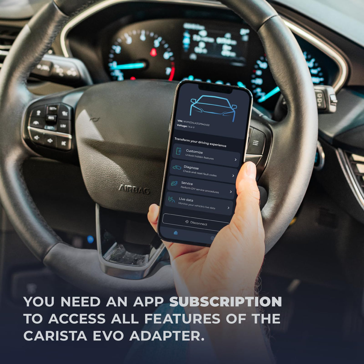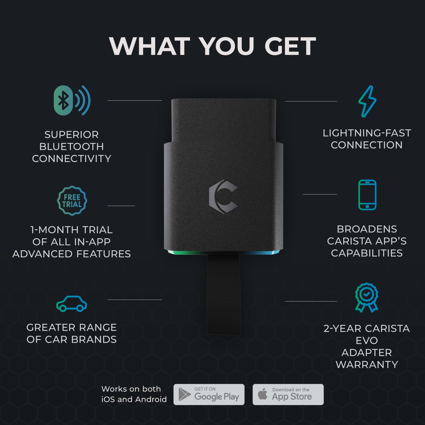 Q: How do I use the Carista EVO with my smartphone?A: To use the Carista EVO, you first need to download the Carista app, available for both Android and iOS devices. Once installed, pair your smartphone with the Carista EVO device via Bluetooth to access diagnostics and customization features.
