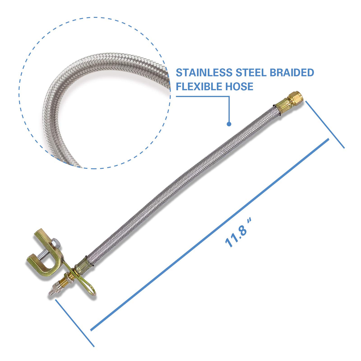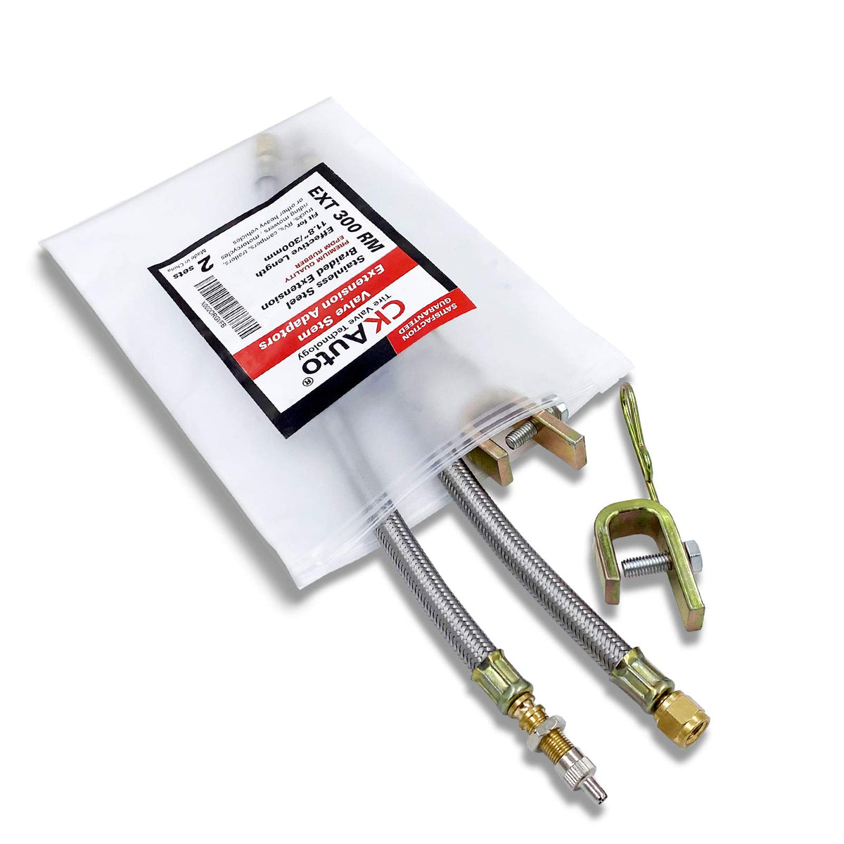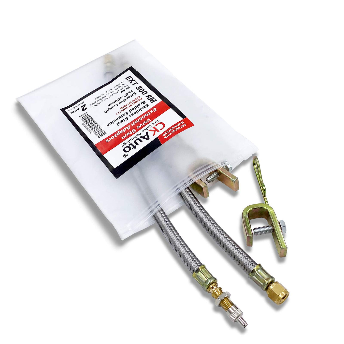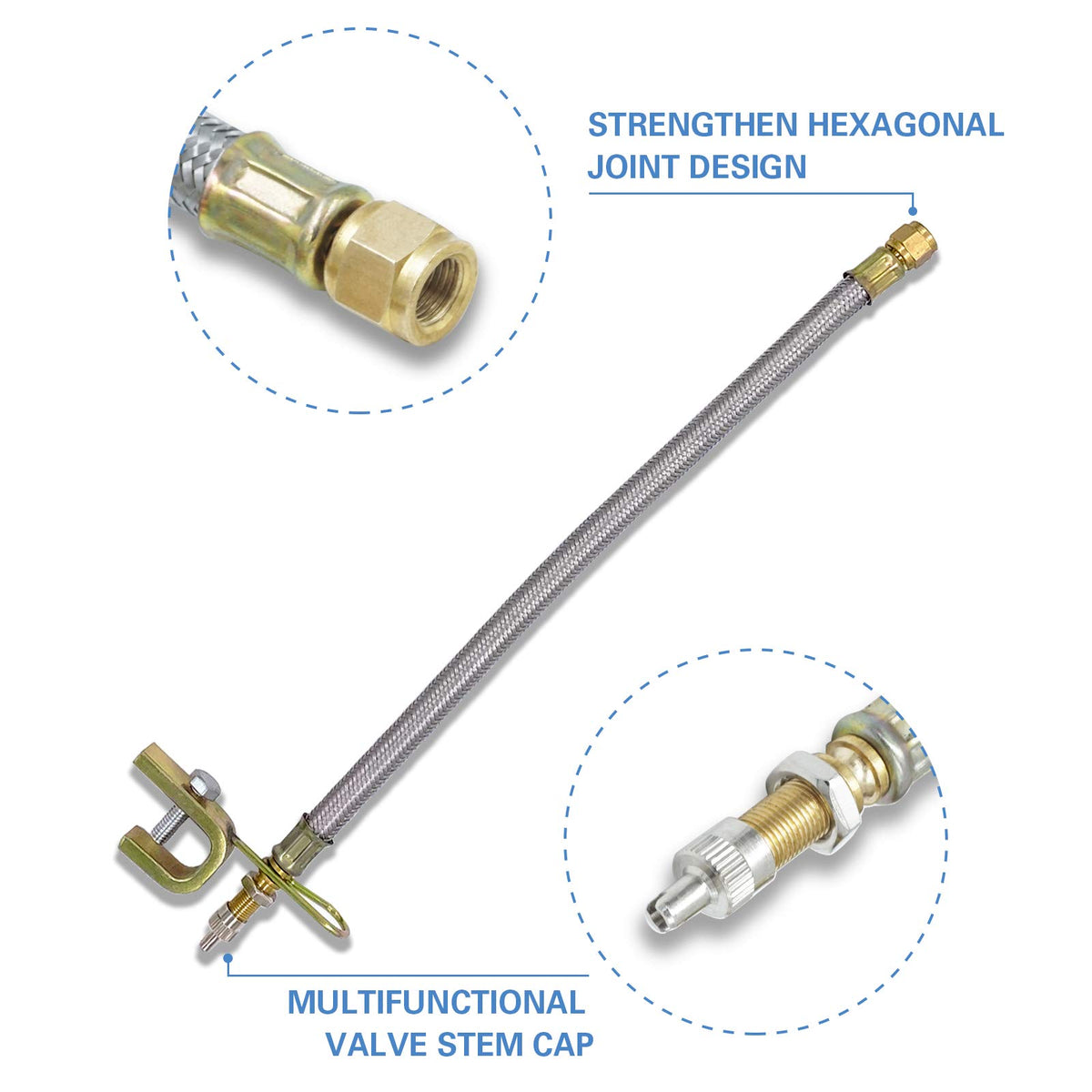 The tire Valve Stem Extension is made of EPDM rubber, which has the advantages of bending resistance, high strength and corrosion resistance. The flexible hose is braided 304 stainless steel, which is beautiful, durable, strong, anticorrosive and anticorrosive. With hexagon interface, it is much easier to install than any other products. And thick pure copper material can withstand greater torque. Each extension is equipped with an antirust iron Rim Clamp. The open space of the Clamp is 16mm (0.625 inches)
