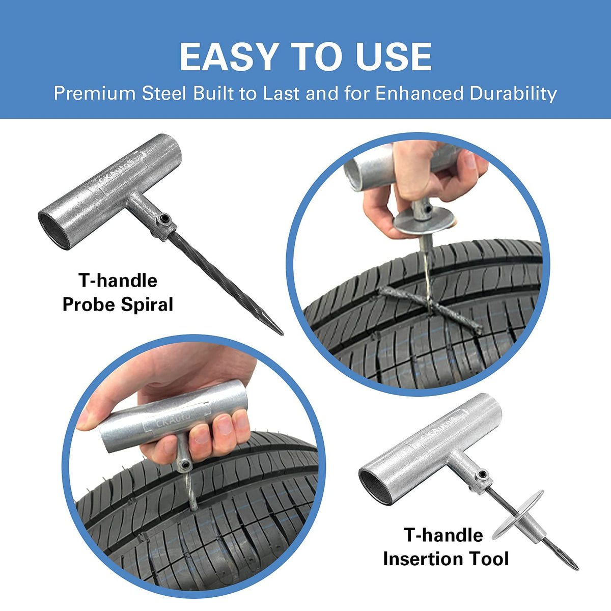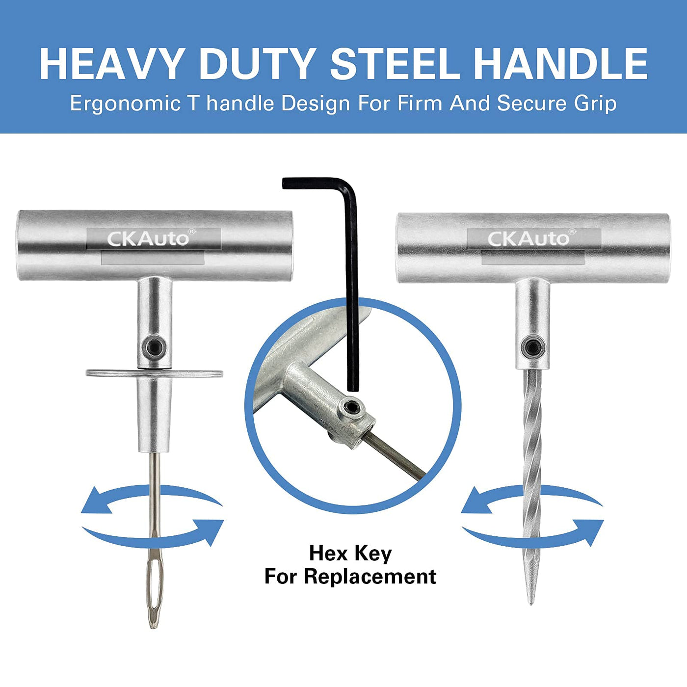 Q: What tools are included in the CKAuto Tire Repair Kit?A: The CKAuto Tire Repair Kit includes essential tools such as a T-handle Insertion Tool, Insertion Tool Replacement, T-handle Probe Spiral, Probe Spiral Replacement, 20 Repair Plugs, Valve Stem Caps, a 4-Way Valve Stem Tool, a jar of lubricant, an 'L' Hex Key, valve cores, a knife, and a portable bag for organization.