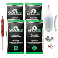 Q: How do I install the Counteract balancing beads in my tires?A: Installation is straightforward with the DIYK-4 kit. Simply use the provided valve core remover to take out the valve core, then use the injector bottle to add the balancing beads directly into the tire through the valve stem. If you're having new tires mounted, you can also use the Drop In Bag system by placing the inner bag of beads inside the tire cavity before it is sealed.