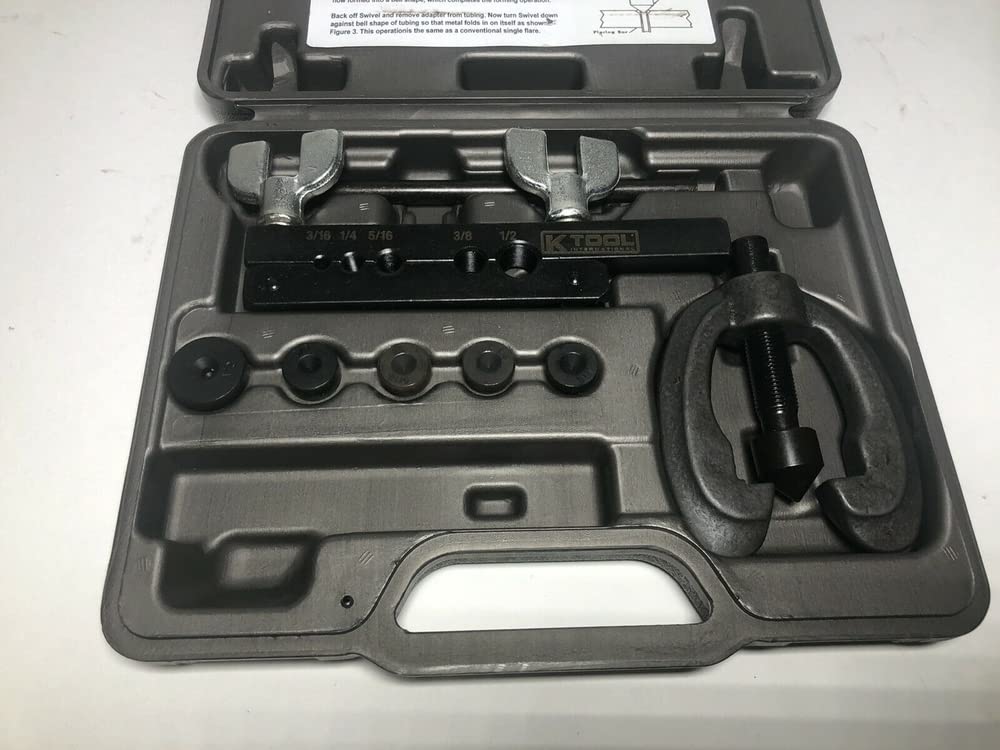 K Tool International Professional Double Flaring Tool Kit Is Designed To Provide A Safer Flare For Brake And Fuel Lines. It Has Center Screw Which Is Made Of High Grade Alloy Steel And Swivel Is Heat-Treated, Precision Ground And Plated To Reduce Friction. This Tool Kit Is Complete With Blow Molded Case And Is Made In U.S.A.