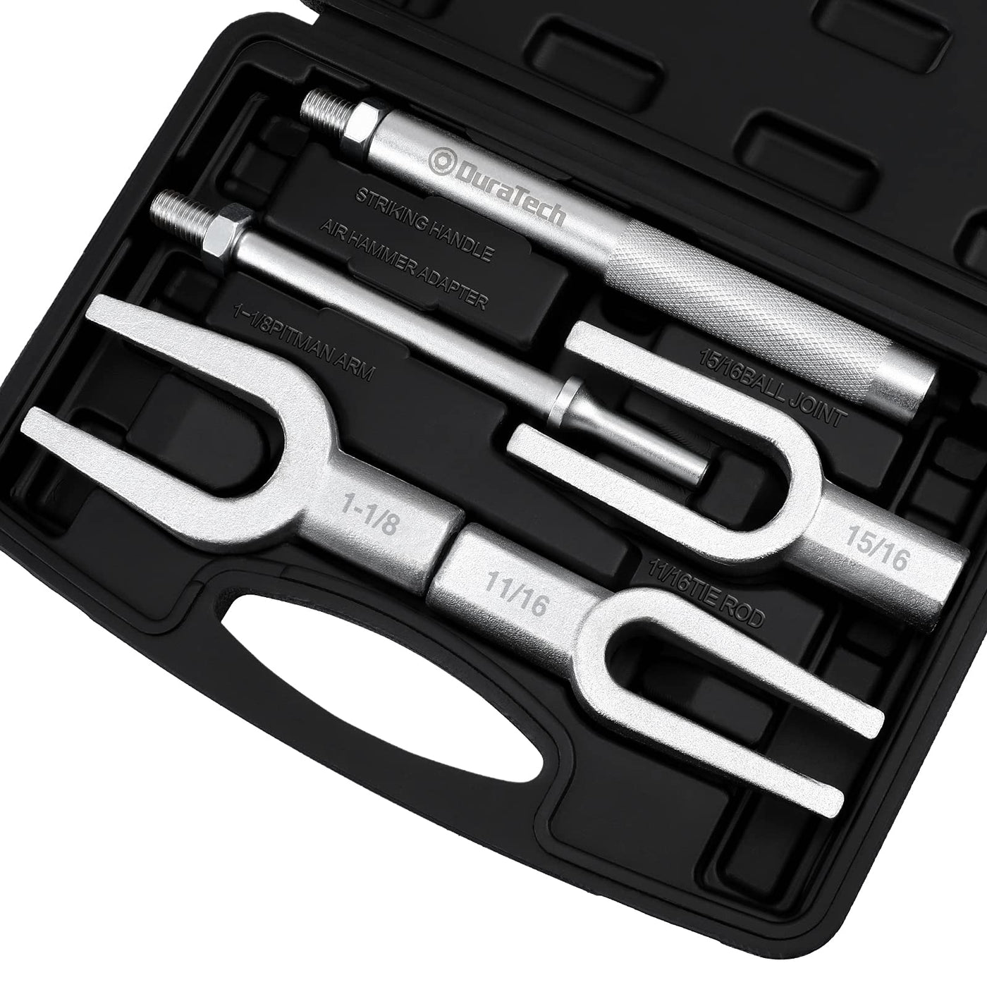 Q: What is included in the DURATECH 5-Piece Ball Joint Separator Set?A: The DURATECH 5-Piece Ball Joint Separator Set includes a variety of tools specifically designed for separating ball joints, tie rods, and other components in vehicles. The set features different sizes of pickle forks, including 1-1/8", 15/16", and 11/16", making it suitable for a range of cars and light vans.