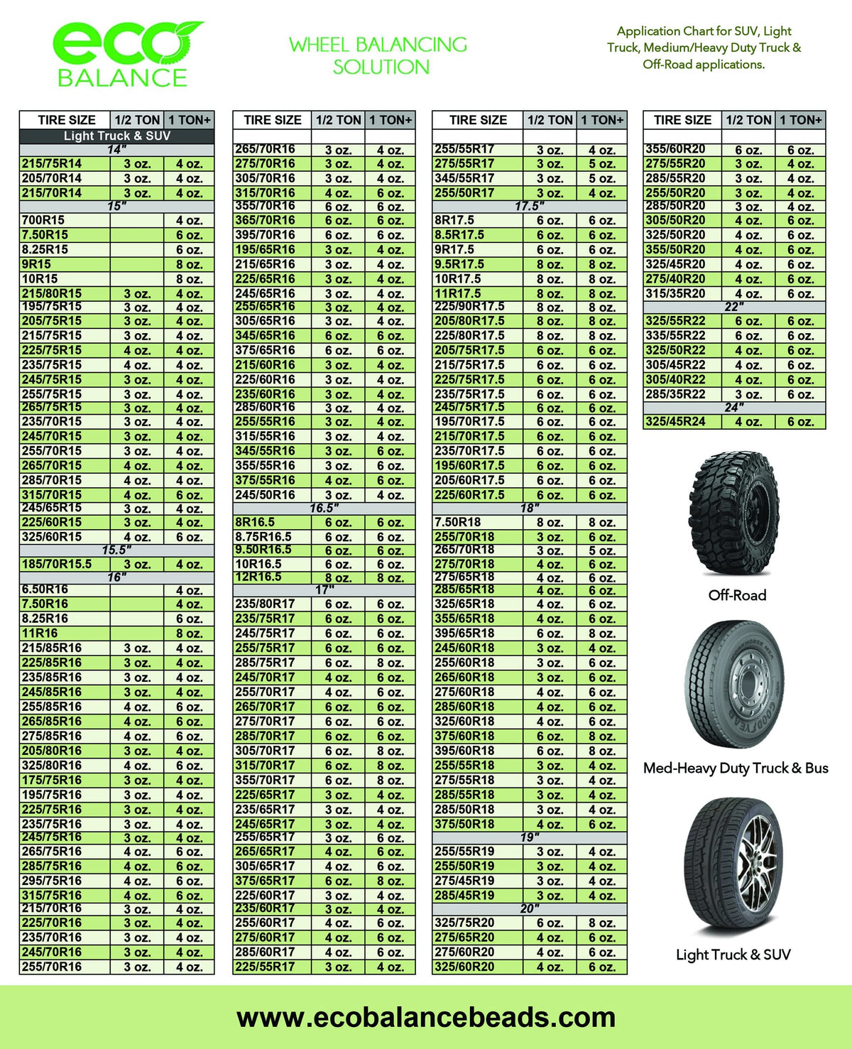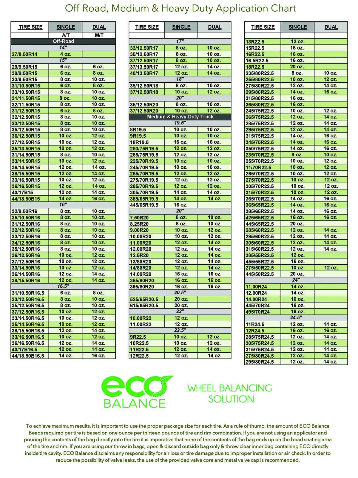 ECO Balance or any other internal tire balancing product is NOT recommended for us in small passenger cars ( Such as a Honda Civic, Small Crossovers, SUV etc.). This product is only recommended in vehicles with a 1/2 ton suspension and up, Off-Road Vehicles, Motorcycles, ATV, UTV, Commercial Vehicles, Bus, RV and more. ECO Balance Beads is the only tire and complete wheel assembly balancing product on the market proven to improve fuel economy in two separate S.A.E and TMC type II tests. ECO Balance Beads are manufactured as a tempered glass bead that is placed inside a tire, or injected through the valve stem, allowing for a complete tire & wheel assembly balance without the use of external wheel weights. ECO Balance extends tire life, improves fuel economy, balances the complete wheel assembly, decreases vibration and driver fatigue, last for the life of the tire, and is environmentally friendly. The DIY Kits include everything you need to install the product at home via the Valve Stem. If you are having new tires mounted, every bag of ECO Balance 4oz & up is a Drop In Bag system. Simply open your ECO Balance Balancing Beads bag, and place the inner clear bag inside the tire cavity as it is being mounted. Once the tire is sealed and mounted to the vehicle, the bag will break on its on when the vehicle starts to move.