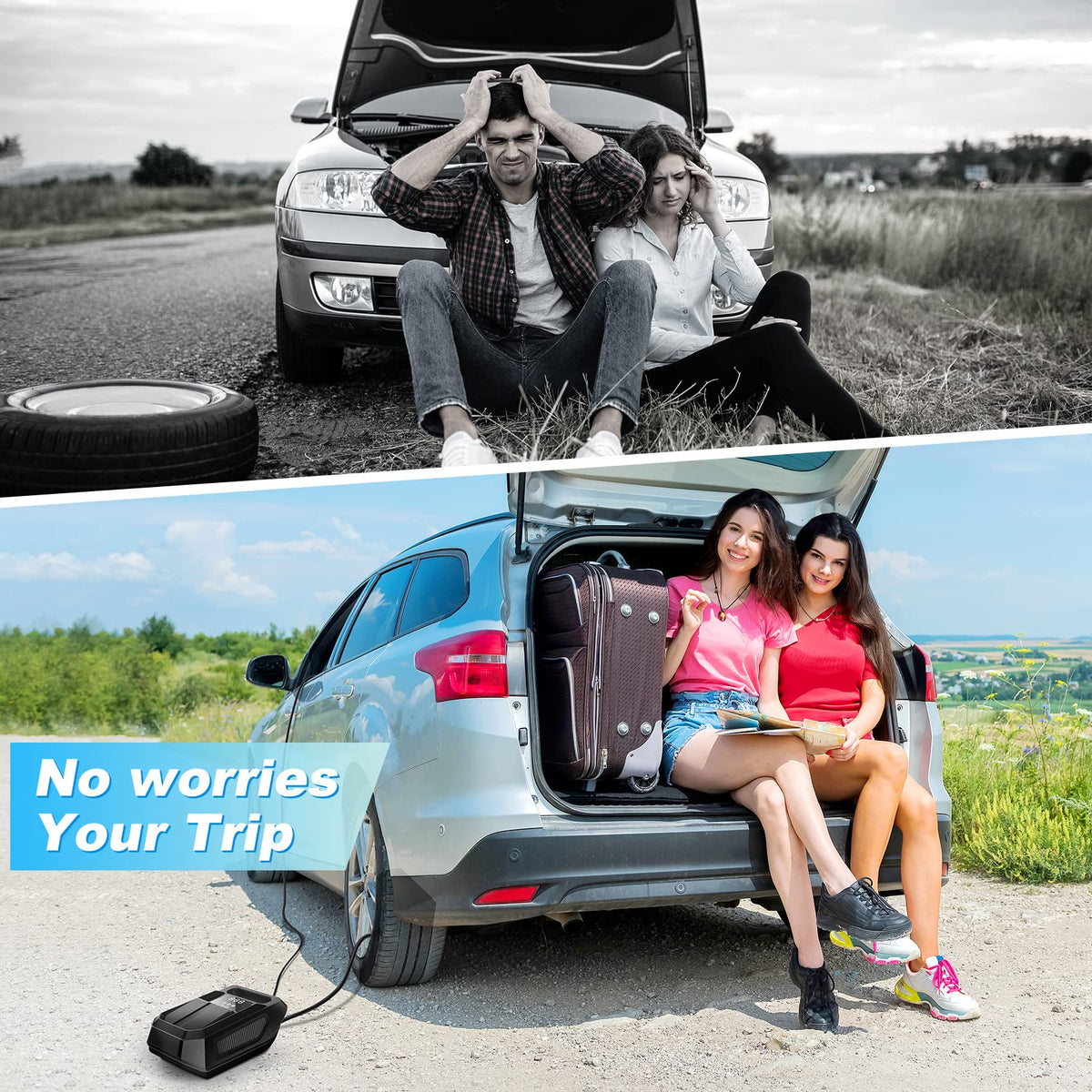 Safety And Reliability - Correct Tire Pressure Is The Most Important Aspect Of Safe Driving. Under-Inflated Or Over-Inflated Tires Are Prone To Failure, Which Can Be Dangerous To The Driver And Passengers. Car Tire Inflators Are An Excellent Solution For Emergencies On The Way. | Fast Inflating & Easy Operation - Simply Preset Your Desired Tire Pressure On The Digital Led Screen, And It Will Quickly Inflate The Tire To The Desired Pressure. The Tire Inflator Will Automatically Shut Off When The Preset Pressure Is Reached. Press The ''R'' Key To Switch Pressure Units Psi, Bar, Kg/Cm2. To Extend The Service Life, Please Allow The Inflator To Rest For 15 Minutes After Every 15 Minutes Of Use. | Portable And Compact - There Is A Handle On The Top Of The Tire Inflator, Which Is Convenient To Carry. And A Groove On The Back For Storing The Power Cord And Inflation Cord. The 11.8-Foot Rope Can Be Easily Connected To All 4 Tires. Equipped With Bright Led Light, It Can Be Used Very Conveniently At Night, And Also Has Flashing Light And Sos Two Modes. | Wide Range Of Applications - In Addition To The Original Nozzle, The Tire Pump Is Also Equipped With 6 Additional Nozzles.It Suitable For Automobiles, Motorcycles, Bicycles, All Kinds Of Balls, Etc. However, For Some Inflatable Products With Slower Inflation Speed, Such As Inflatable Beds, Large Swimming Rings, Kayaks, Etc., The Blower Is More Suitable For Them. | Warm Service - The Tire Inflator Is Carefully Designed And Compact In Size. It Is Convenient To Put It In The Car For Emergency Use. Regular Use Of An Air Pump To Maintain Tire Pressure Will Not Only Improve The Safety Of The Vehicle, But Also Reduce Tire Wear And Tear. If You Have Any Other Questions, Please Do Not Hesitate To Contact Us, We Will Be Happy To Serve You.