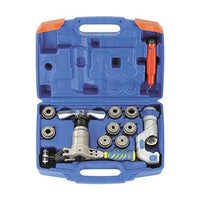 Q: What is included in the Flaring Tools Kit?A: The Flaring Tools Kit includes a flaring tool, eight wide-range heads for various tubing sizes (1/4", 6mm, 5/16" (8mm), 3/8", 10mm, 1/2", 12mm, 5/8" (16mm), 3/4" (19mm) O.D. tubing), a tube cutter, a deburring tool, and a hard plastic carry case.