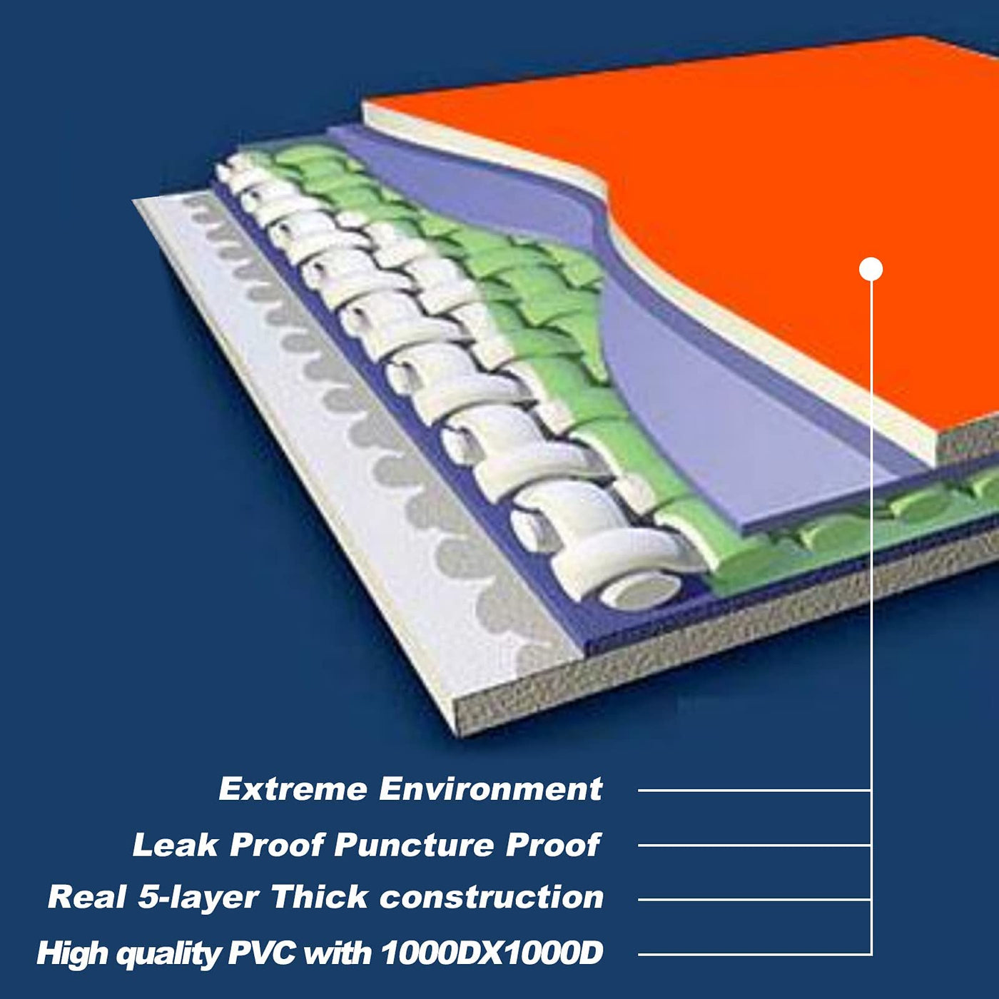 Q: What materials are used in the construction of this air jack?A: The air jack is made from sturdy 1000 Denier Nylon and industrial-grade high strength polyester fiber, coated with environmentally friendly, tear-resistant PVC material for enhanced durability and longevity.