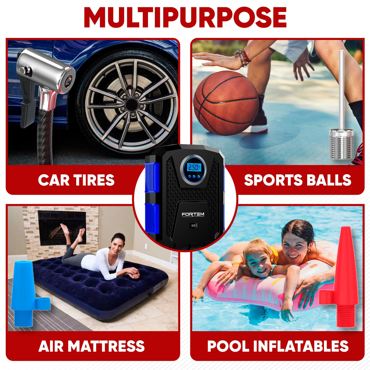 Q: Can I use the FORTEM Tire Inflator for items other than tires?A: Yes, the FORTEM Tire Inflator is multi-purpose and can be used to inflate sports balls, air mattresses, pool toys, and other inflatables, making it a versatile tool for various needs.