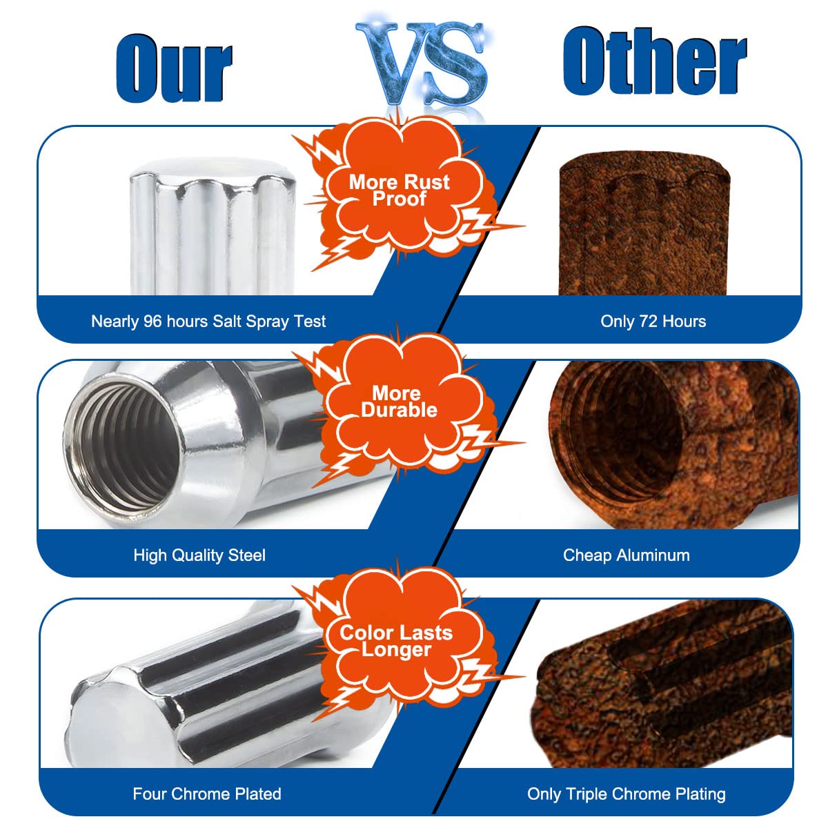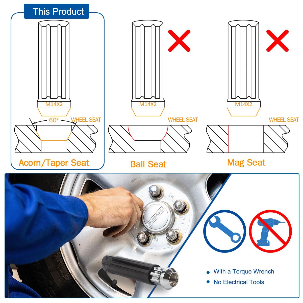 'Only for vehicles with 14x1.5 bolts and Cone Seat 60 Degree. Product Description: 1. Quantity: Set of 24 tuner lug nuts. 2. Color: Chrome 14 x2.0 lug nuts . 3. Thread Pitch: 14mm x 2. 4. Overall Length: 2'''' (50 mm). 5. Hex Tool Size: 13/16'''' (21mm)&7/8'''' (22mm). 6. Seat: Conical 60 Tapered. 7. Material: Through-Hardened Steel. 8. Features: The solid one-piece design is safer than the ''''cap'''' design. Our chrome lug nuts are made of high-quality steel. After Four-layer plating and 96 hours of salt spray test, apply anti-rust oil. Not easy to rust and fade. 9. Benefits:Improve the appearance of your vehicle. Please Note: Before ordering, please check the size of the truck nuts on the wheels. Although the installation is simple, professional installation is still recommended. Improperly installed hardware may cause the 7 spline lug nuts to break or loosen during driving, which may result in an accident. Do not use impact wrenches/tools.Torque lug nuts to manufacturer specifications using a torque wrench.
