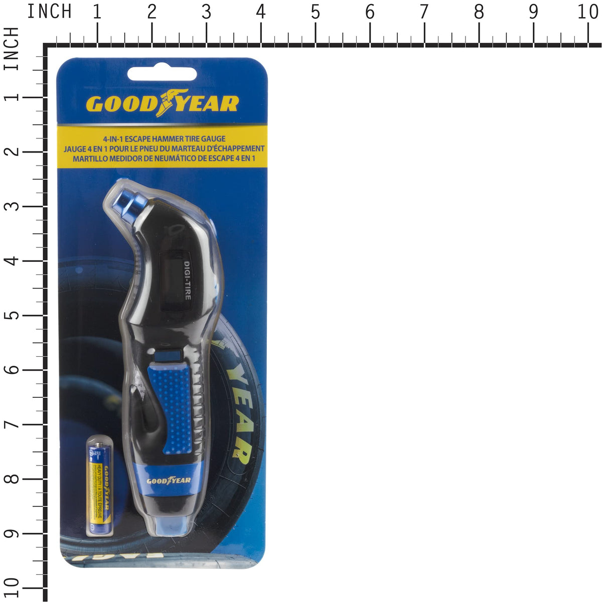 Goodyear Premium 4 In 1 Digital Tire Gauge Is So Much More Than Just A Tire Gauge. You Get A Glass Break Tool And A Seatbelt Cutter As Well As An Led Flashlight Plus The Digital Tire Gauge. The Digital Gauge Provides Three Scale Measurements (Psi Bar And Kps-Kilopascal). No Need For You To Perform Calculations To Get Readings In Alternative Units Of Measure. Range 5 To 150 Psi. Includes 1Xaaa Battery. Use It At Night Or During The Day. The High Peak Intensity Of The Ldc Display Screen Produces Bright And Clear Numerals That Are Easy To See. This Digital Tire Pressure Gauge Reading Is Less Affected By Vibration So It Should Not Need Calibration As Often. So Simple To Use - Just Press On To The Valve Stem And The Gauge Can Read The Pressure In Two Or Three Seconds. This Is A Compact And Lightweight Multi-Tool Tire Pressure Gauge That Makes Long Hauls A Little Less Stressful And Can Help Your Rig Maintain Proper Tire Inflation For Better Fuel Efficiency. No Parallax Error When You Use This Digital Gauge. Approximately 6.5 Inches X 2.5 Inches And Nicely Compact To Store In A Glove Compartment Or Fit Into A Pocket.Compact Design - Easily Store In Your Pocket When Ready To Use Or Store In Your Dash Among Your Must-Have Car And Truck Accessorieseasy To Read - The Large Lcd Digital Screen Makes It Easy For You To Read The Tire Pressure Results With A Sharp Display For Increased Visibility