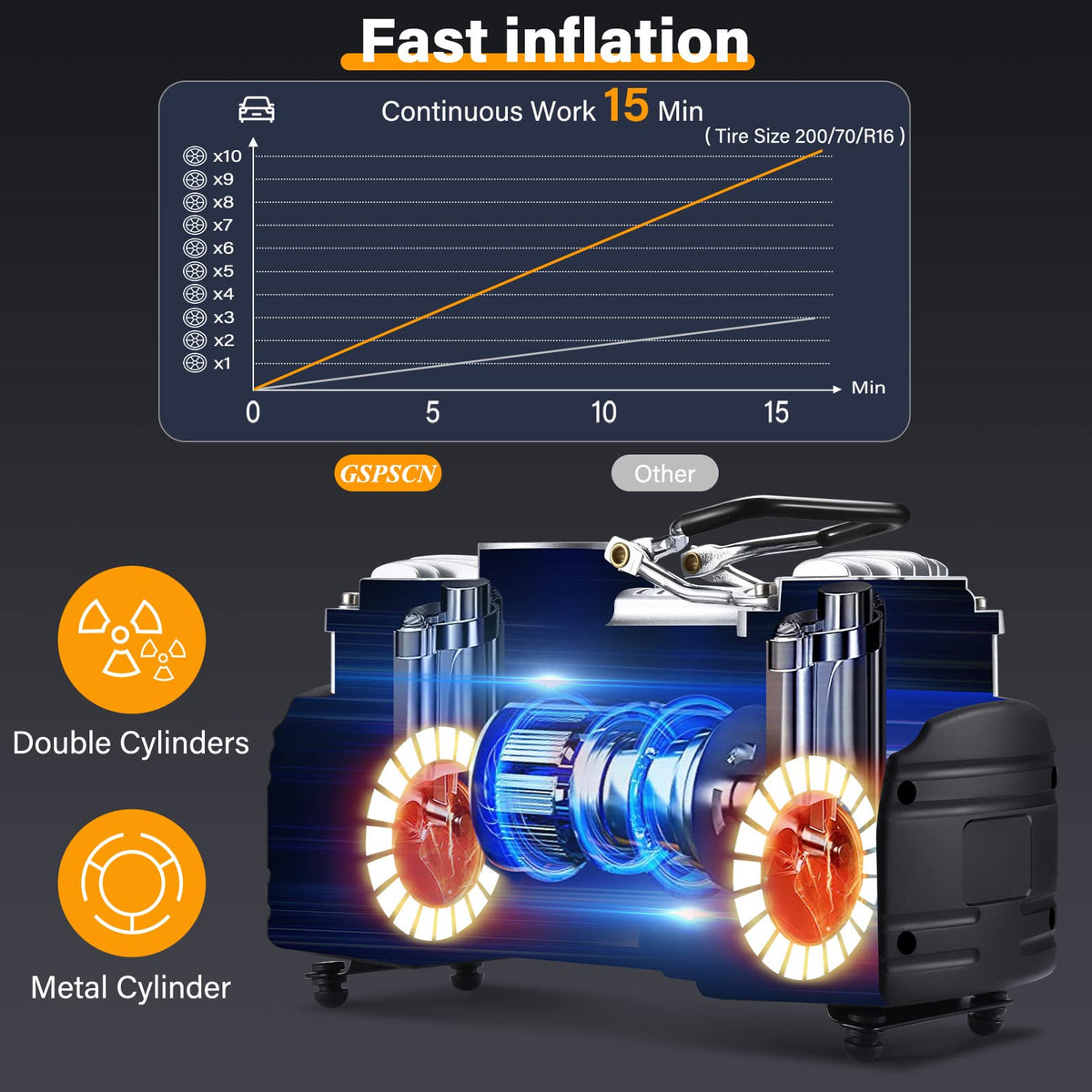 Specifications Certification: Power: DC12V, 25A Max pressure: 150PSI Air flow: 70L/min Measurement: 8.5 x 6.9 x 3 inches Package Weight: 7.2 lbs Caution If you start the pump, tire pressure quickly rise to 50-100PSI, it is the air blocked, must immediately remove the screw connector and re-operation. Features1.1.GSPSCN dual cylinder air compressor can quickly inflate your car tires when the tire leaks or tire pressure is insufficient, this pump uses a high-quality direct drive motor to drive the sturdy metal double cylinder. 2.The LED light design for easy to use even in the dark and make sure you can be seen in an emergency to avoid any potential dangers.With LCD digital pressure gauge (with backlight): You can preset tire pressure to what your tire needs and test the tire pressure at any time. 3.This pump has cigarette lighter with built-in 25A fuse (with spare fuse) , 11.5ft cigarette lighter power cord, 1.8ft inflation tube, high-quality screw connector can be tightly connected to the tire gas mouth, inflates standard vehicle tire in 1.5 minutes (200/70/R16, 0-35psi), sponge wrapped handle is a feature, accessories includes battery clamp and 3 adapters for bicycles, balls, pool toys, sporting equipment, etc., as well as fine Oxford bag for convenient storage and carry. 4.GSPSCN is a professional air compressor brand, We offer the most comprehensive line of air compressors & air accessories for on-road, off-road and industrial markets. tire inflator is reliable and durable and for you to maintain the correct tire pressure and to ensure traffic safety.Package Included: 1 x Portable Air Compressor Pump 3 x Inflatable Adapters 1 x Power Cord With Battery Clamps 1 x Coil Air Hose 1 x User Manual 1 x spare fuse1 x locking air chuck
