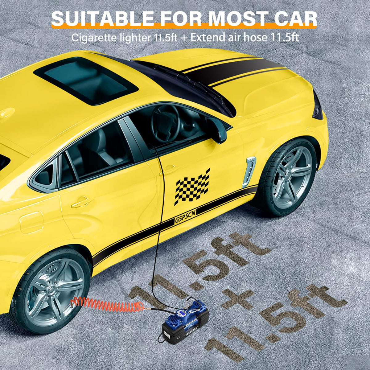 Specifications Power: DC12V, 25A Max pressure: 150PSI Air flow: 70L/min Measurement: 9.4 x 4.4x 7 inches Package Weight: 10.8 lbs Caution 1.If you start the pump, tire pressure quickly rise to 50-100PSI, it is the air blocked, must immediately remove the screw connector and re-operation. 2.If you find any product quality problems, we will promptly answer and solve.Features1.GSPSCN double cylinder air compressor can quickly inflate your car tires when the tire leaks or tire pressure is insufficient, this pump uses a high-quality direct drive motor to drive the sturdy metal double cylinder, so it is a low rotating speed and high efficiency pump, Powerful power can meet most car tires. 2.The LED light design for easy to use even in the dark and make sure you can be seen in an emergency to avoid any potential dangers. 3..This pump has cigarette lighter with built-in 25A fuse , 3.5M cigarette lighter power cord, 1.8ft inflation tube, high-quality screw connector can be tightly connected to the tire gas mouth, inflates standard vehicle tire in 2 minutes (200/70/R18, 0-40psi).Considering the tire leaking,we put a tire repair tool in the toolbox. Tire repair kit includes plier,knife,screw,drivers,tyre repair strip,split-eye insertion needle,rasp tool.Other's accessories includes clamp and 3 adapters for bicycles, balls, pool toys, sporting equipment, etc., Package Included: 1 x Portable Air Compressor Pump 3 x Inflatable Adapters 1 x Power Cord With Clamps 1 x Coil Air Hose 1 x User Manual 1x Plier 1x Knife 2x Screw drivers 5x Tyre repair strip 1x Split-eye insertion needle 1x Rasp tool 1x Toolbox1x Locking air chuck