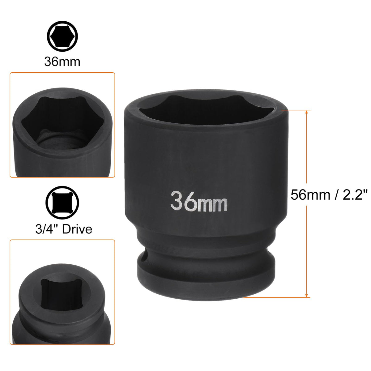 Q: What size is the HARFINGTON 6-Point Impact Socket?A: This impact socket has a drive size of 3/4 inch and a 6-point socket size of 36mm, making it suitable for a variety of fastening applications.