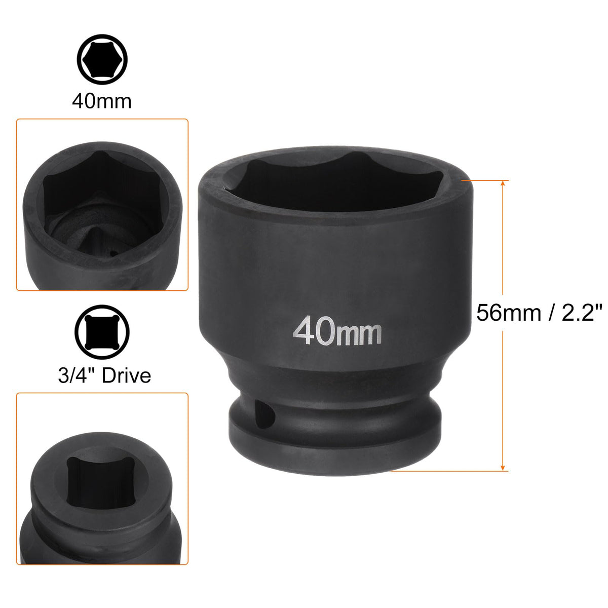 Q: What are the dimensions of the 3/4" Drive 40mm socket?A: The socket has a drive size of 3/4 inch and a 6-point socket size of 40mm, with a total length of 56mm (approximately 2.2 inches).