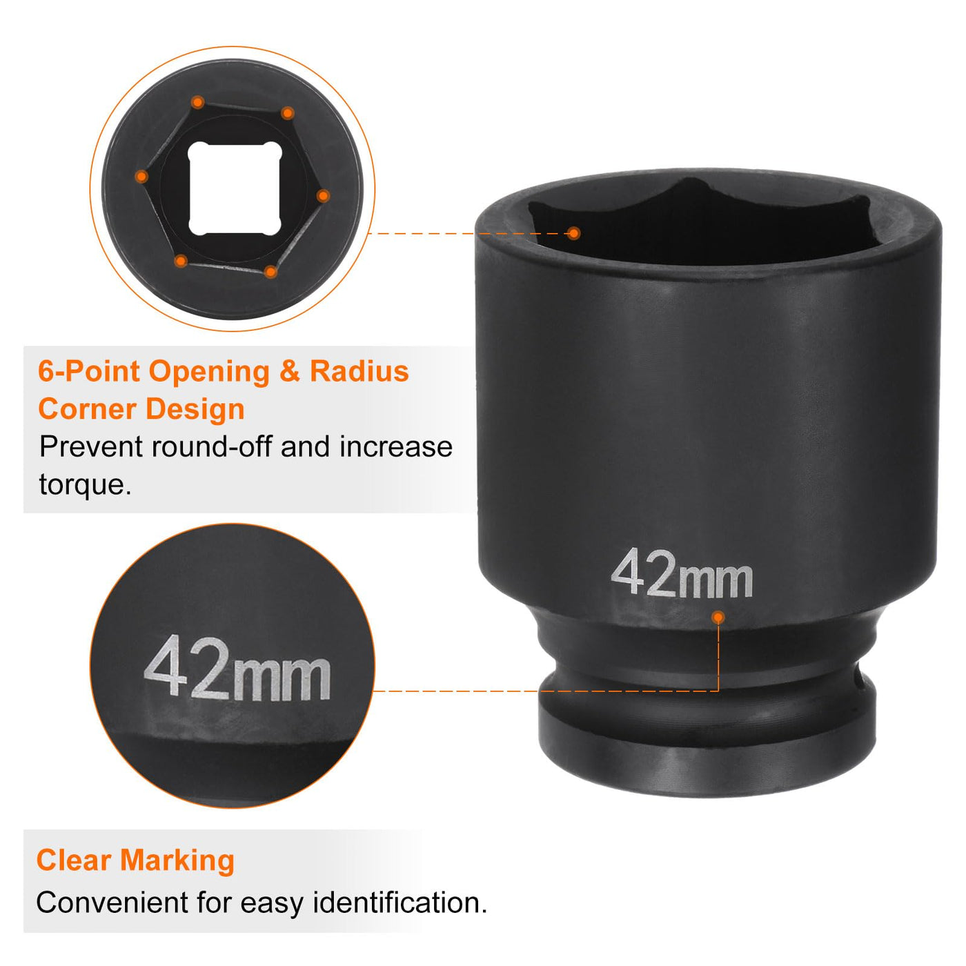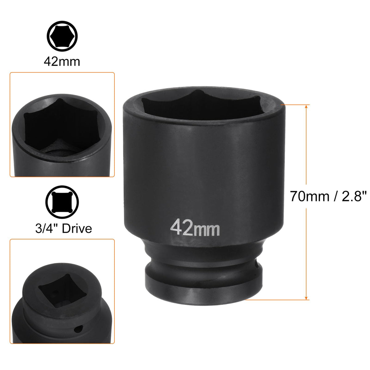 Q: What is the size and drive of the HARFINGTON Impact Socket?A: The HARFINGTON 6-Point Impact Socket features a 3/4-inch drive and a socket size of 42mm.