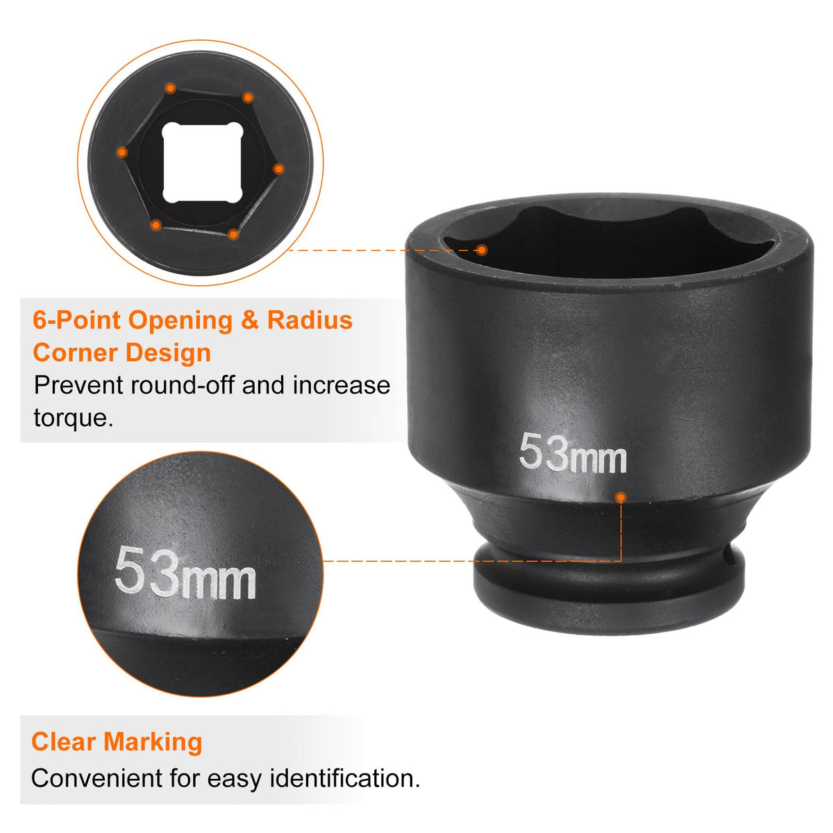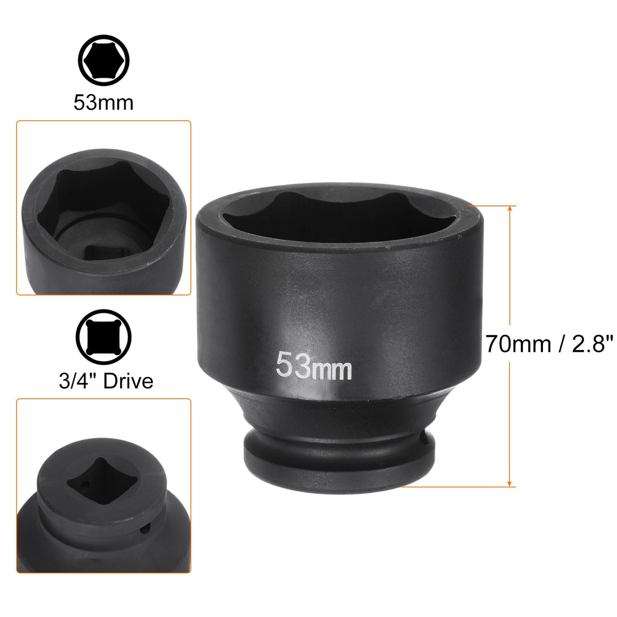 Q: What is the size of the HARFINGTON 6-Point Impact Socket?A: The HARFINGTON 6-Point Impact Socket has a drive size of 3/4 inch and a socket size of 53mm.