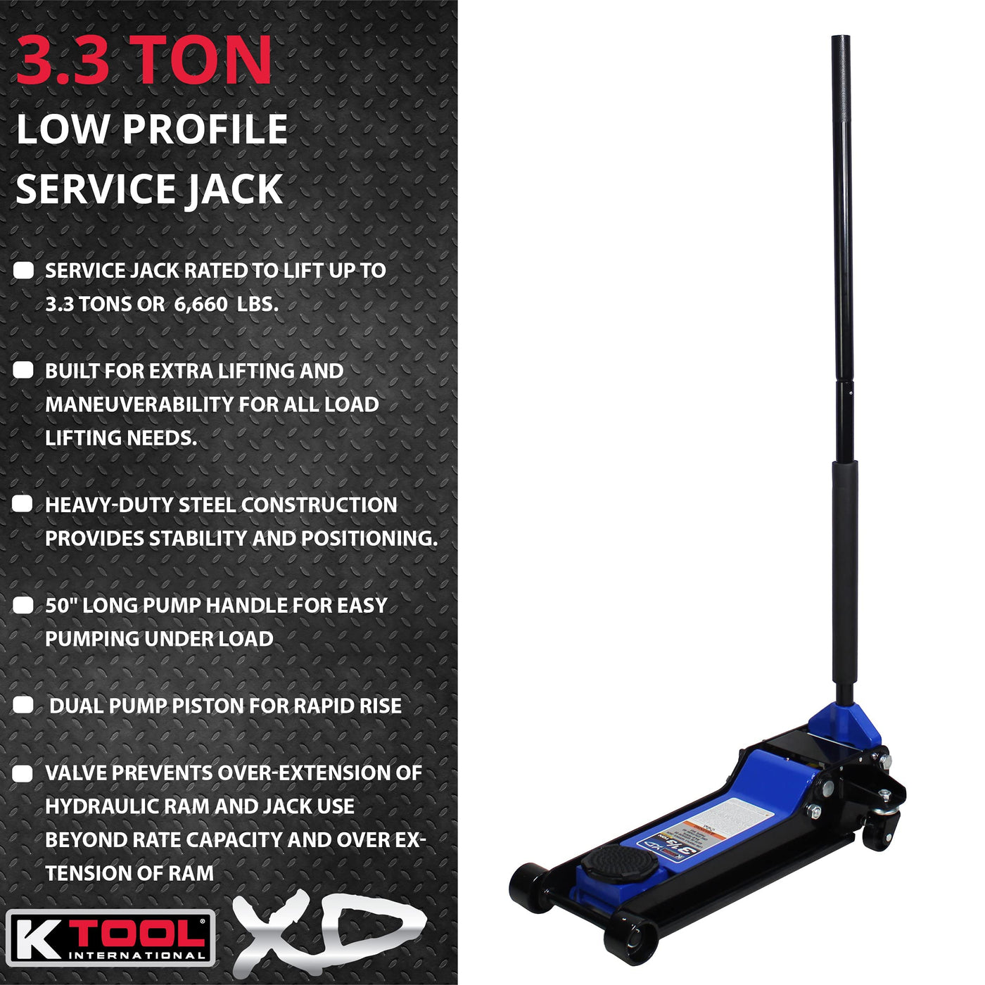 Descriptionthe K Tool International 3.33 Ton Low Profile Service Jack Will Get The Job Done! With A Capacity Of 3.33 Tons Or 6,660 Pounds This Service Jack Provides The Opportunity To Lift A Variety Of Vehicles To Meet Your Shop Or Personal Garage Needs. Everyone Wants Reassurance Their Equipment Will Work And Be Long Lasting. Ensuring The Ram Doesn'T Over Extend The Jack Has A Built In Valve System To Prevent Use Beyond Rated Capacity And Over Extension. The Heavy Duty Steel Constructions Provides Stability And Positioning. This Service Jack Is Very Easy To Use. With A Low Profile It'S Easy To Store And Provides Greater Access And Range. It Is Also Easy To Maneuver And Position Within The Shop. Since 1984, K Tool International Leads The Market By Ensuring That Its Products Are Rugged, Reliable And Reasonably Priced.