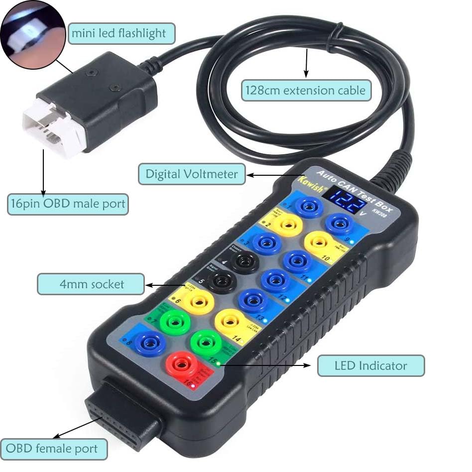 Kawish Obd2 Breakout Box Obdii Protocol Detector For Power/Grounds Detector 16-Pin Can Bus Test Breakout Box With Led Display Obd2 Diagnostic Connector Detector For All Obdii Vehicle Main Functions: 1. Obd Signal Detection: 16 Led Lights Detect Obd Signal. Pins Show Leds On Signal Detection, Blinking Leds For Ecu Activity, Leds Can Detect Pwm (J1850) Vpw (J1850) Iso 9141-2, Dis/Iso 14230-4 (12V Automotive And 24V Diesel) Can Bus ( J-2284) (Saej1939) Power Signal And Ground Signal. 2. Obd2 Male To Female Extension Cable: 1.5 Meters In Length, Can Be Connected Between The Diagnostic Link Connector (Dlc) And The Scan Tool. 3. All Obd Signal Breakouts With 4Mm Banana Jacks: 16 High-Quality 4Mm Banana Jacks Breakout All Obd Signals, Convenient For Tdetail More Multimeters Or Oscilloscopes For Detailed Signal Analysis. 4. Battery Voltage Monitor: 3-Digit Blue Led (Resolution: 0.1 V) Voltmeter Can Continuously Digitally Display The Voltage, And The Measuring Range Is 8-30V. So The Box Can Not Only Detect Car Signals, But Also Some Diesel Signals, Such As K Line L Line And Can Bus Diesel Engine (Saej1939) 5. Obd Connector Flashlight Function: Obd Male Connector Has A Flashlight Function And Button, Flashlight Will Be Very Useful When Operating In The Darkcommodity Parameters1. Working Voltage: Dc 8V-30V2. Maximum Load: Up To 5.0 Amps3. Obd Cable Length: 1.5 M