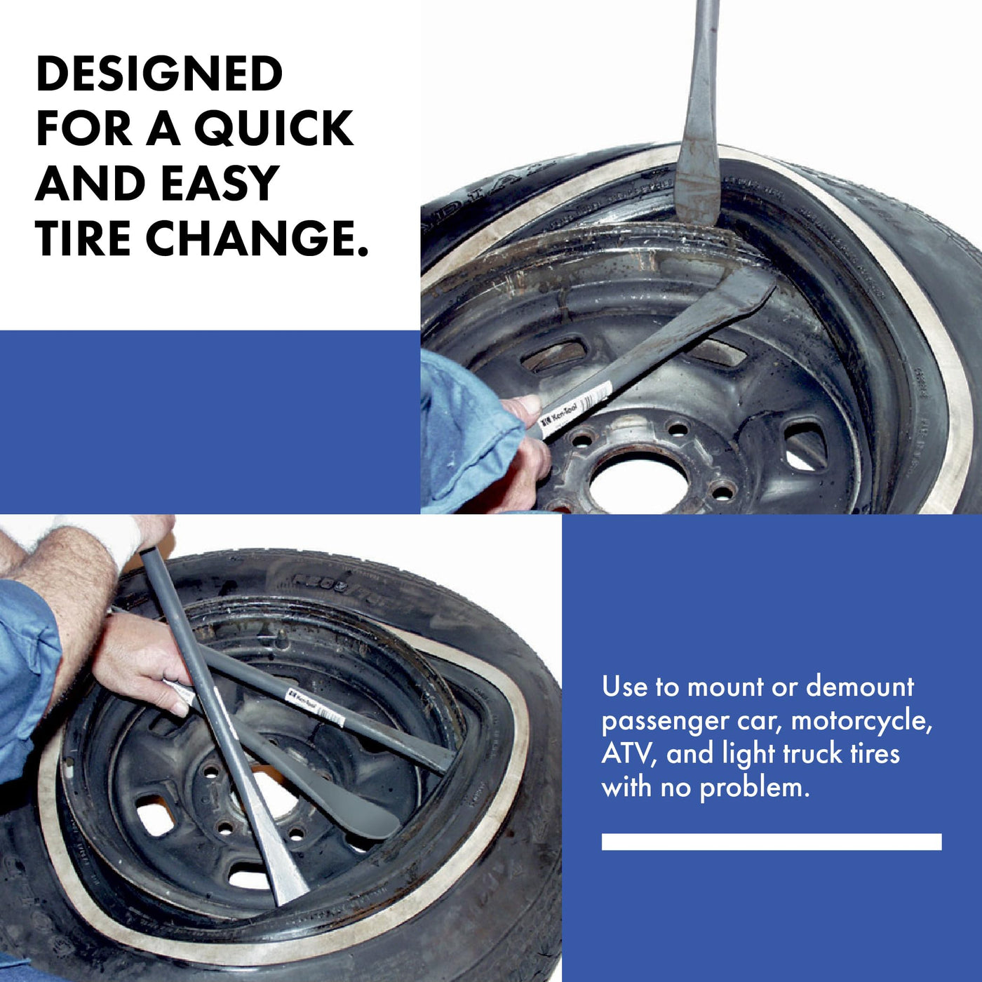Q: How does the curved design of the Ken-Tool spoon improve tire changing?A: The curved design of the Ken-Tool spoon allows for easier leverage and better control during the tire changing process, making it faster and more efficient to mount or demount tires.