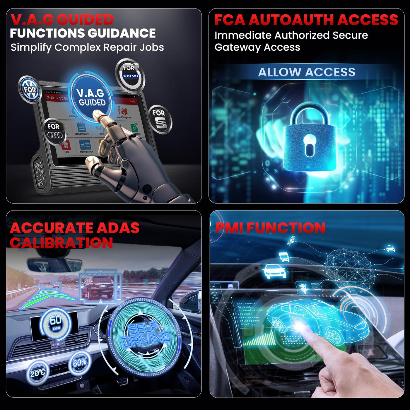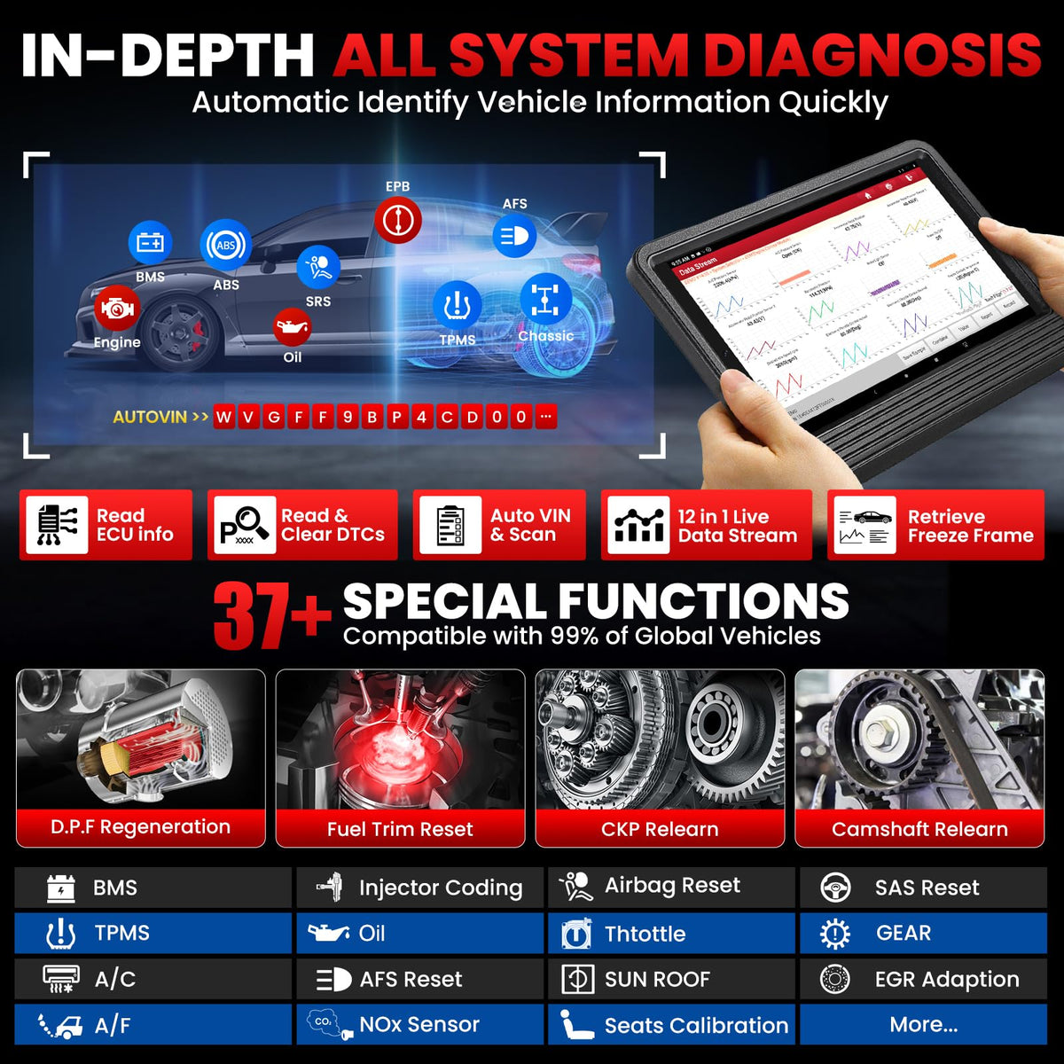 Q: What special functions does the LAUNCH X431 V Pro 5.0 Elite offer?A: This scan tool provides over 38 special functions, including bi-directional control, online coding, active tests, adaptation, initialization, and matching, making it versatile for various diagnostic needs.