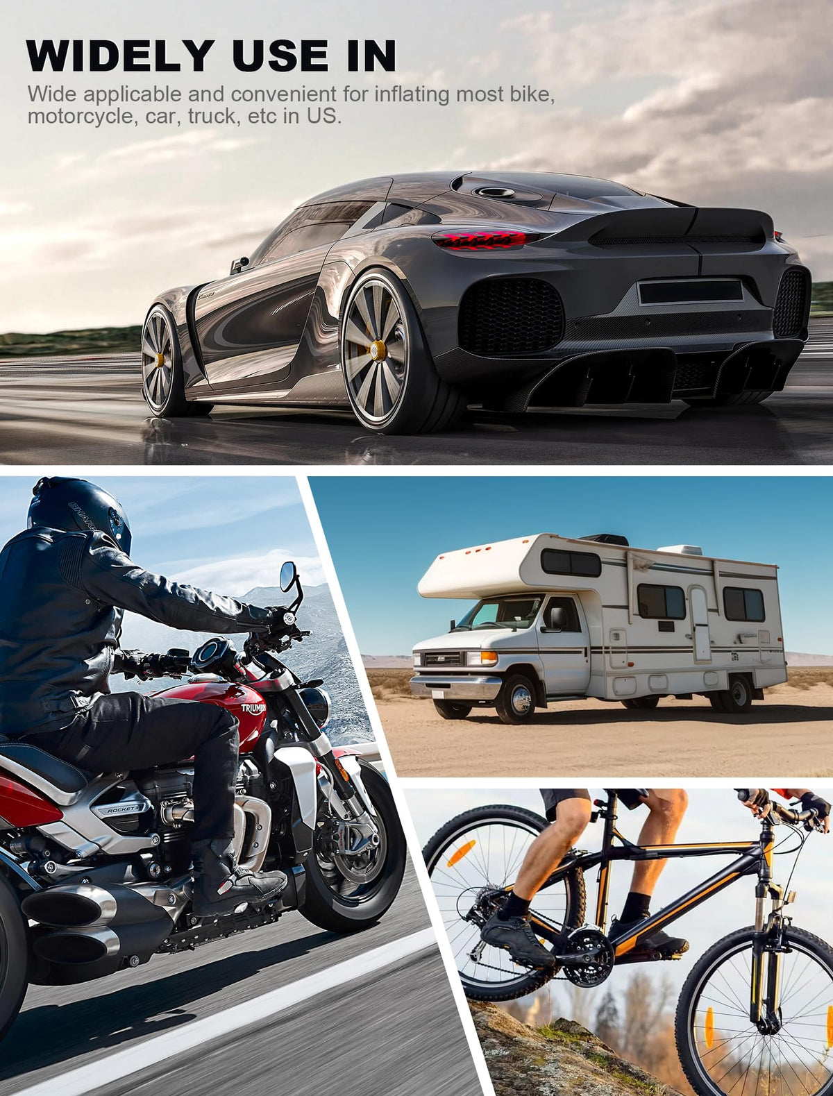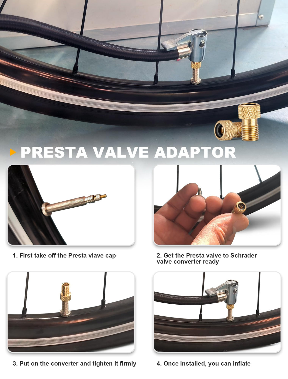 LUMITECO 12'' Tire Inflator Extension Tube, Tyre Pump Quick Inflation Chuck Adapter Hose for Quick-Inflation, Clip-On Connector High-Pressure Tube Car Motorcycle Bicycle Maintenance Accessories LUMITECO 20'' Tire Inflator Hose Adapter, Lock On Air Chuck w/Converting Nuts & Presta Valve Adaptor for Air Compressor, Schrader Valve Adapter for Tire Pump's Twist On Convert to Lock On Connection ??Package Includes?1 x 20 inch tire inflator hose adapter, 1 x Presta Valve Adaptor, 2 x common Converting Nuts. A highly practical combination for both commercial and home use. Wide applicable and convenient for inflating most bike, motorcycle, car, truck, etc in US. ??No Air Leaking & Easy Operation?Open flow 90 degree thumb-press air chuck, just put it onto tire valve stem and press to lock, excellent lock-on tight seal make sure no annoying air leaking, brings you an easy & quick hands-free inflation. ??Standard Connection & Presta Valve Adaptor?With standard US Schrader Valve Fine Thread Connection(0.305''ODx32TPI), the same thread as all US standard car valve stems(tire nozzle). Along with a Presta Valve Adaptor and two Converting Nuts, allows you to convert Presta valves to Schrader valves and even Presta Valves to use this air chuck. ??Solid construction & Durable?Portable tire inflator chuck adapter for bike, motorcycle, car air fill, with all-metal construction, corrosion-resistant and sturdy. Equipped with premium braided hose, which is not easy to break and wear, and durable enough to withstand long-term use. ??20 Inch Lengthened & Flexible?20'' extended tire inflator/pump hose adapter with high quality strengthen nylon-wrapped rubber hose, covers more distance and provides more flexible space. Allowing easy access to the tires or other areas that need to be inflated.