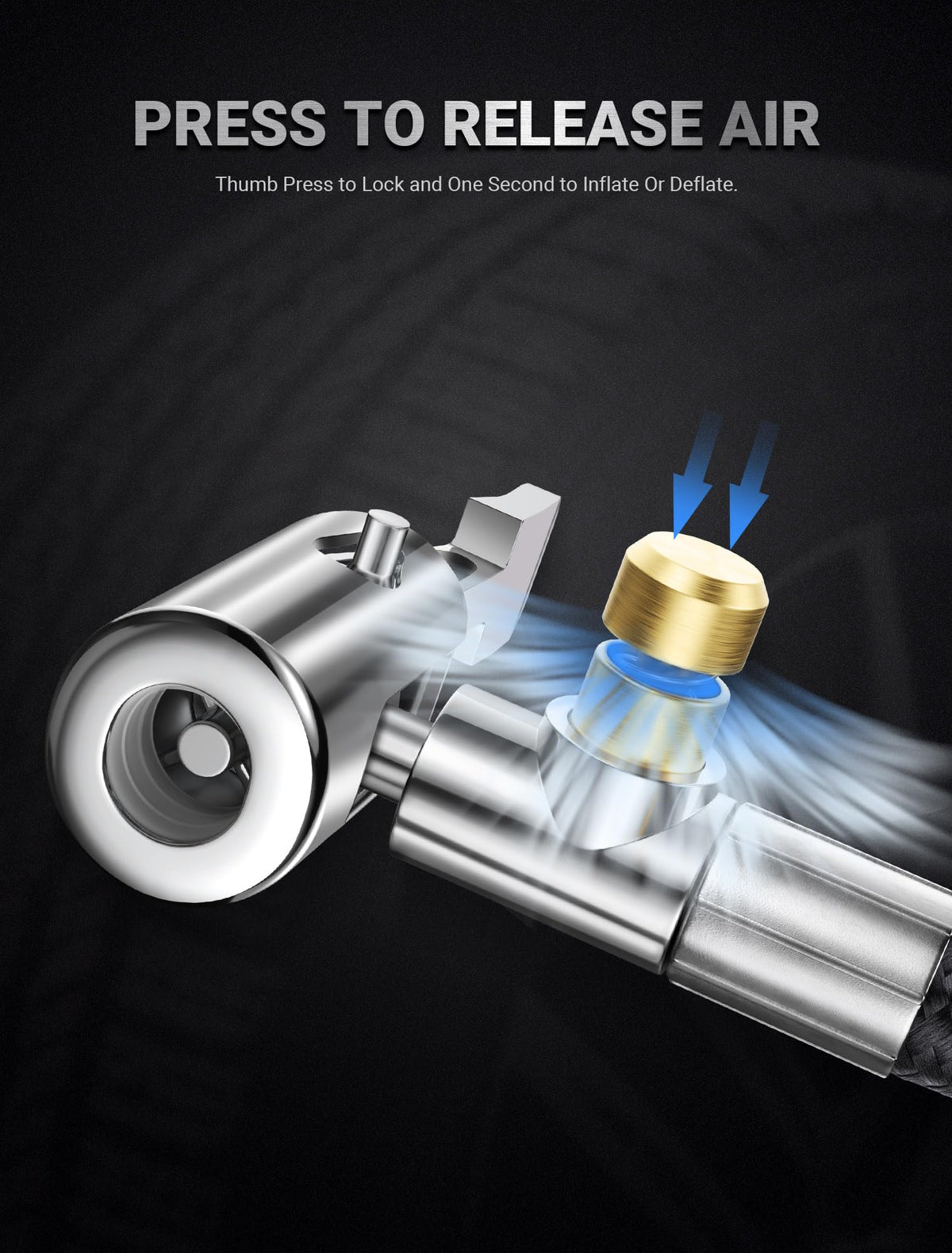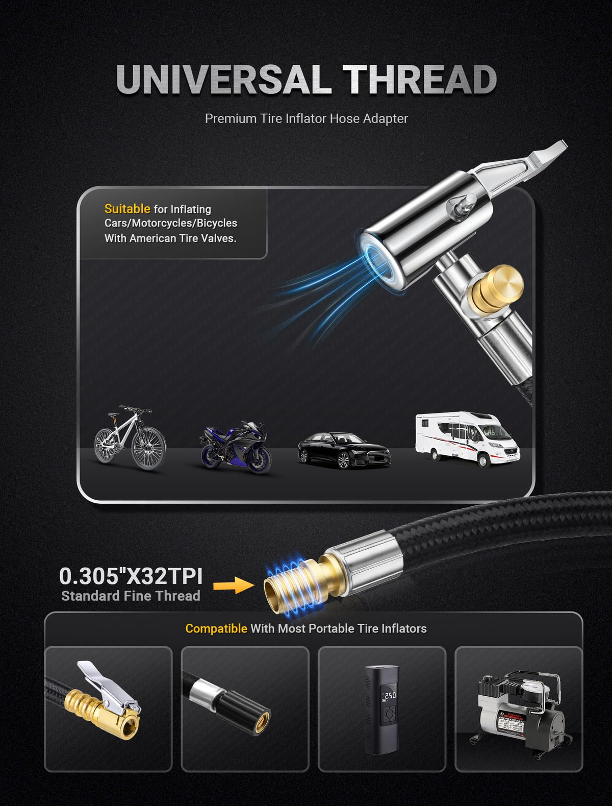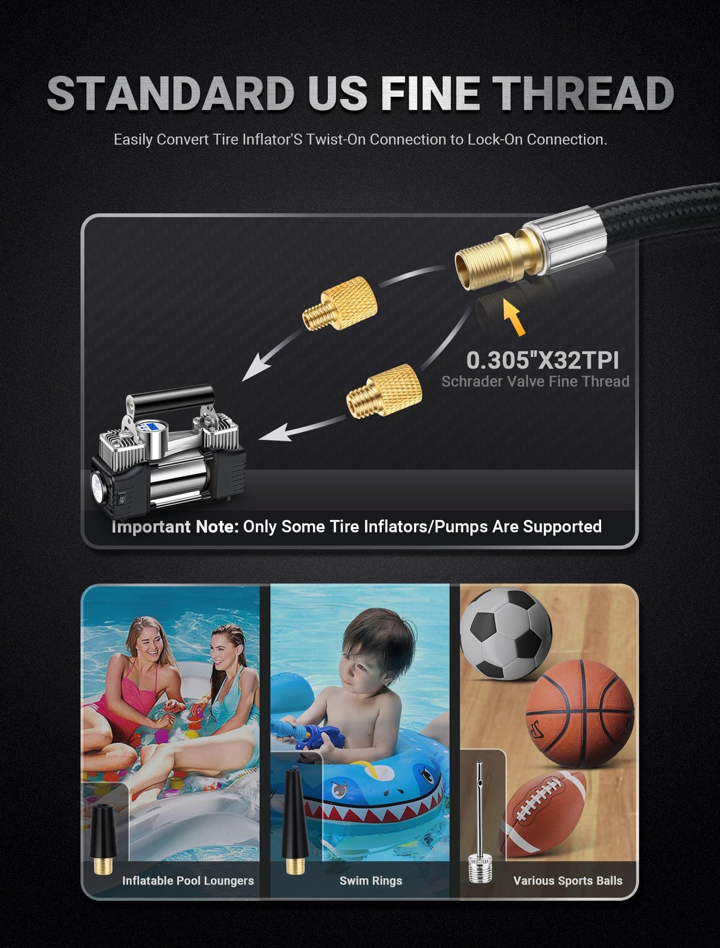 LUMITECO 33'' Air Release Extension Hose, 7-Pack Tire Inflator Extention Tube w/Presta Valve Adaptor&Ball Pump Needle Kit, Tire Valve Air Chuck Lock for Bike Pump Portable Air Compressor Accessories?PACKAGE INCLUDES?: You will receive 7pcs inflator hose set, including 1x 33''/84cm extend air pump hose, 1x Presta Valve Adaptor(American type to French type), 1x Ball Needle Adaptor, 2x Tapered Nozzles, 2x Converting Nuts.?QUICK AIR RELEASE FUNCTION?LUMITECO lock on air chuck hose adapter has an air release button designed to eliminate having to remove the valve to check pressure and bleed off excess air if overinflated. Thumb press to lock and one second to inflate or deflate.?UNIVERSAL THREAD?Standard US schrader valve fine thread connection(0.305''x32TPI), compatible with most portable tire inflators. A presta valve adapter to convert presta valves to schrader valves. Also comes with universal needle inflator tools, making them useful attachments for compressors, electric air pumps, also ideal for inflatable toys, air bed, various sports balls, balloon, yoga ball, swim ring,etc.?SOLID CONSTRUCTION & DURABLE?All metal construction. High quality strengthened nylon-wrapped rubber hose, sturdy air pump adapter head and quick release locking function make it easy to connect quickly to those space constrained valves and lock tightly onto valve stems in the process of air inflation.?BUY WITH CONFIDENCE?Your essential tool kit in emergency and daily use for quick hands-free inflation. We always stand behind all of our items with 100% satisfied customer care, just buy with your 100% confidence today.