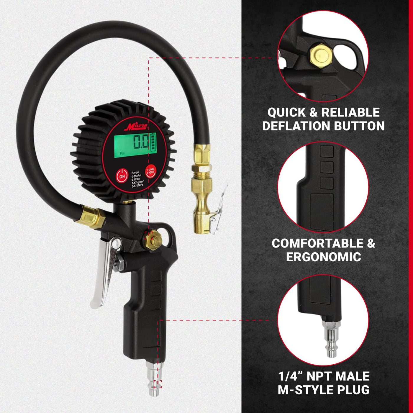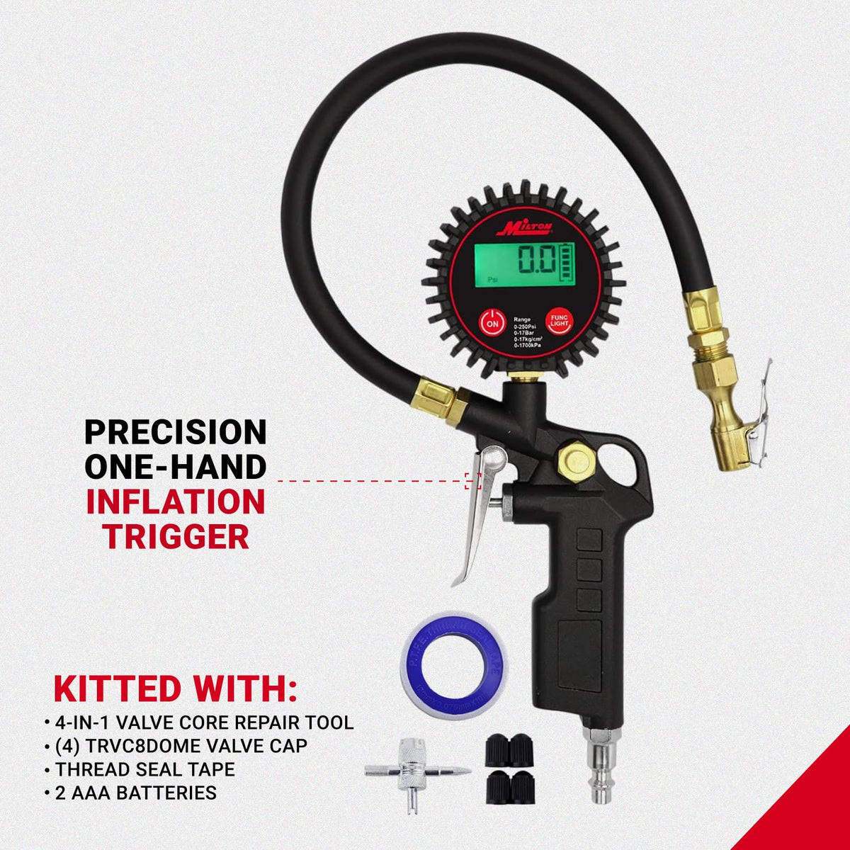 Milton 507Kit Digital Tire Inflator Car Accessories W/Accurate Air Tire Pressure Gauge, 14 Rubber Air Hose - 250 Psi, Brass L