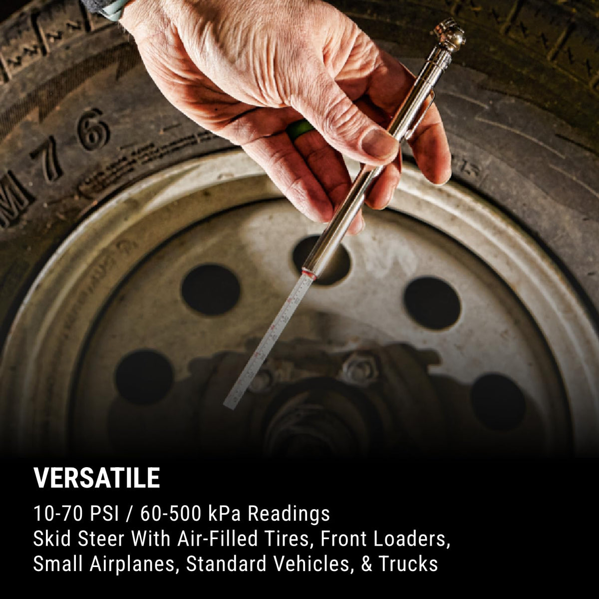 Milton (S-920) Pencil Tire Pressure Gauge With Tread Depth Gaugethis Single Head Pencil Tire Pressure Gauge Comes With Both A Deflator Button And Built-In Tire Tread Depth Gauge. Unlike Our Competitors, Our Milton Pencil Gauges Use Machined Parts. Offers A Range Of 10 To 70 Psi Or 60-500 Kpa. Tire Gauges Provide Accurate, Long Life With Trouble-Free Performance. Made From Durable Plated Brass With 4 Side Nylon Indicator Bar. Always Check Tire Pressure When Tires Are Cold.Drive Safely: Maintaining Proper Tire Pressures Improves Vehicle Handling, Reduces Risk Of Tire Failure, Improves Fuel Economy, And Increases The Life Of Your Tires.
