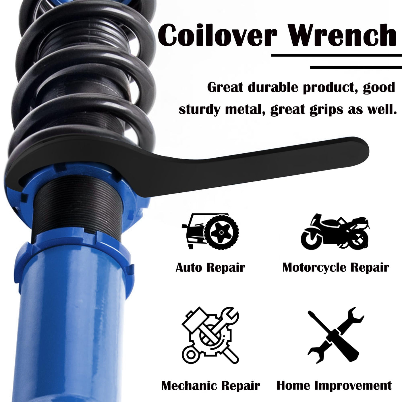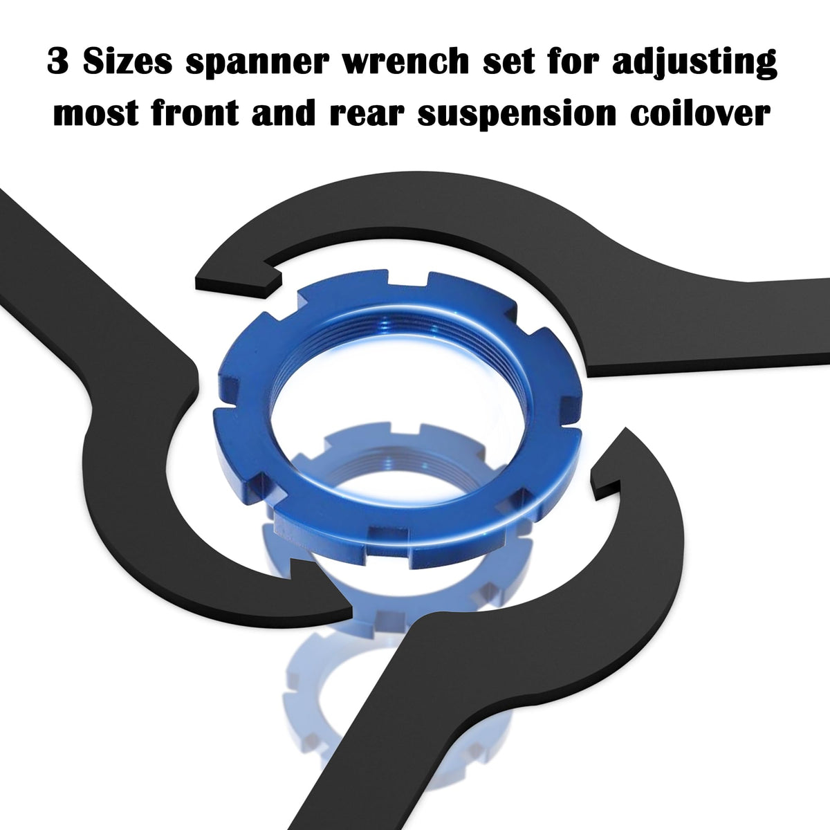Q: What sizes of wrenches are included in the MOEBULB Coilover Adjustment Tool kit?A: The MOEBULB Coilover Adjustment Tool kit includes four wrenches: one 55-65MM wrench, one 65-75MM wrench, and two 80-90MM wrenches, allowing for versatile adjustments on various coilover setups.