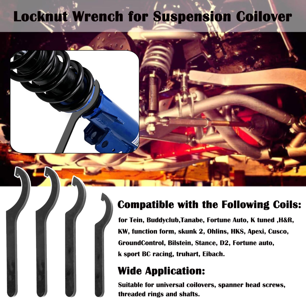 Q: What vehicles are compatible with the MOEBULB Coilover Adjustment Tool?A: The MOEBULB Coilover Adjustment Tool is compatible with a wide range of vehicles equipped with coilovers from brands such as Tein, Buddyclub, Tanabe, Fortune Auto, K Tuned, H&R, KW, Function Form, Skunk 2, Ohlins, HKS, Apexi, Cusco, GroundControl, Bilstein, Stance, D2, Fortune Auto, K Sport, BC Racing, Truhart, and Eibach.