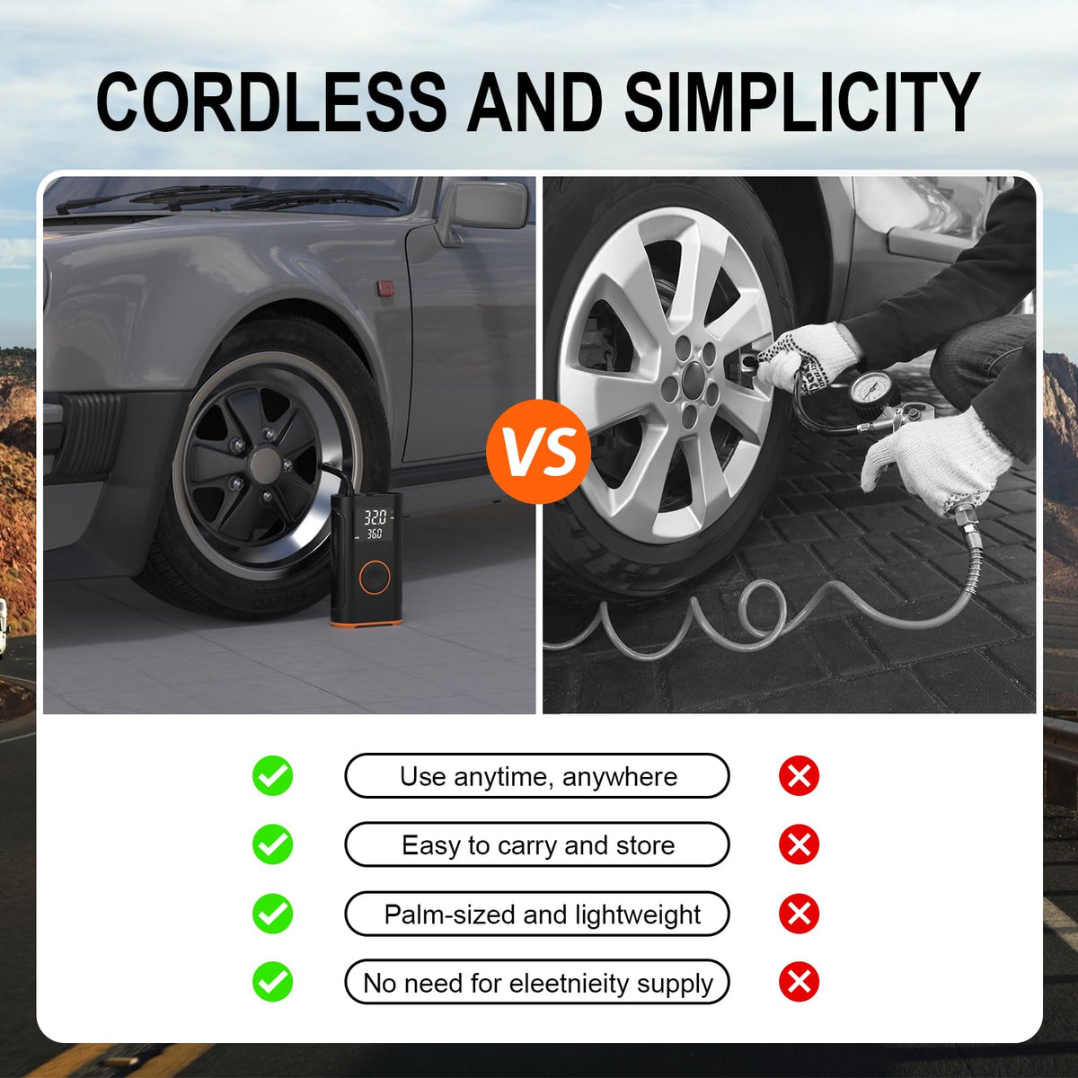 Enhance Your Inflation Experience with Our State-of-the-Art Air Compressor Are you tired of the time-consuming process of inflating tires, sports equipment, or recreational items with outdated or inefficient tools? Say goodbye to frustration and hello to efficiency with our cutting-edge tire inflator. Designed for modern users who prioritize performance and convenience, this inflator is a game-changer in maintaining optimal pressure for a variety of items. Let me guide you through why our tire inflator is the essential tool you need in your life Unmatched Flexibility: Whether it's car air pump, bike tire pump, basketball pump, or air mattress pump, our inflator's powerful 160 PSI maximum pressure ensures you're equipped to handle any task. With 5 inflation modes, including customizable settings, you can effortlessly adjust to the ideal pressure Precision Redefined: Say goodbye to guesswork with our integrated high-precision tire pressure gauge, boasting an accuracy of 1 PSI for perfect inflation every time. Stay informed with the easy-to-read LED display providing real-time updates Emergency Preparedness: More than just a tire inflator portable air compressor, our product features built-in LED, SOS, and flashing lights, making it a must-have in any emergency kit. Whether you're in low-light conditions or facing unexpected situations, we've got you covered Power On-The-Go: Never be caught with a dead phone or gadget again. With a TYPE-C charging port and 5V/2A USB output, our car tire pump doubles as a power bank, ensuring your devices stay charged when you need them most Multi-Functional Tool: Enjoy the convenience of a device that not only inflates but also acts as a power bank, LED light, and more. Why clutter your space with multiple tools when one can do it all Don't compromise on quality or convenience when it comes to inflating your items. Upgrade your inflation experience with our revolutionary inflatable pump and discover a new level of efficiency, reliability, and versatility. Embrace the future of inflation and make the smart choice for enhancing your lifestyle. Experience the difference with our state-of-the-art air pump today