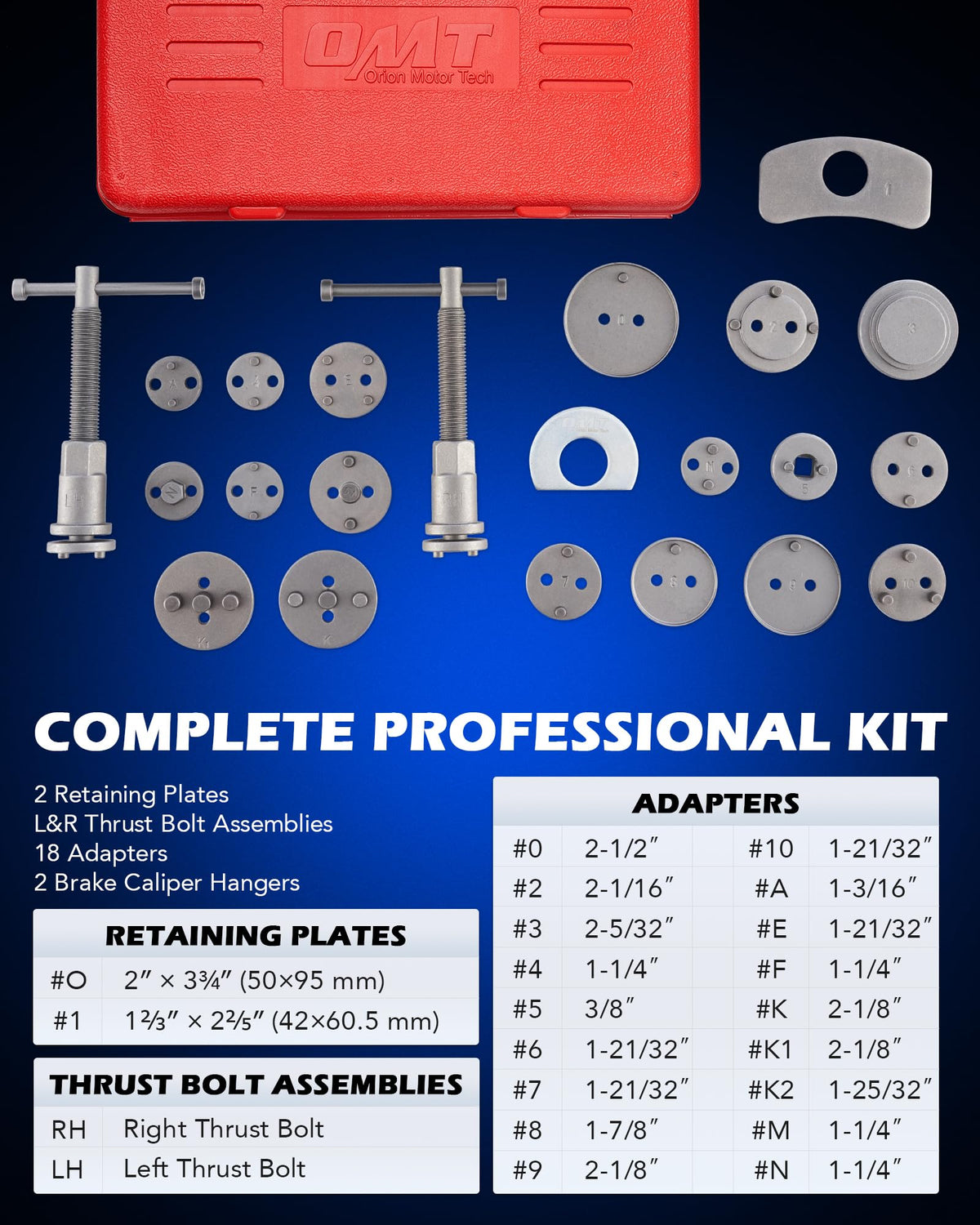 Are Your Brakes Starting To Pull Or Squeal? It'S High Time To Service Them And, If You Want To Do It Yourself, Orion Motor Tech'S 24-Piece Brake Caliper Tool Kit Will Let You Get The Job Done Right Pdq. Service Your Brakes And Rotate Your Pistons Back Into Their Calipers Without Damage To Them Or The Boot. The Two Thrust Bolt Assemblies, Twin Retaining Plates, And 18 Adapters In This Caliper Compression Tool Kit Mean You'Ll Be Able To Work With The Disc Brakes On Nearly All Domestic And Import Vehicles. Precision Crafted From Structural-Grade 45# Steel For Strength And Durability, Each Part Has Been Subsequently Sandblasted For Long-Lasting Wear And Corrosion Resistance. Whether You Are Just A Beginner Or An Experienced Mechanic, You'Ll Find These Brake Tools And Their Instructions Helpful In Getting Your Work Done More Easily, More Quickly, And With Less Damage To Your Pistons And Boots.