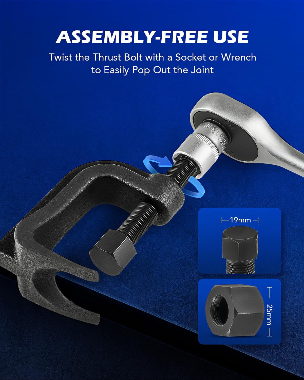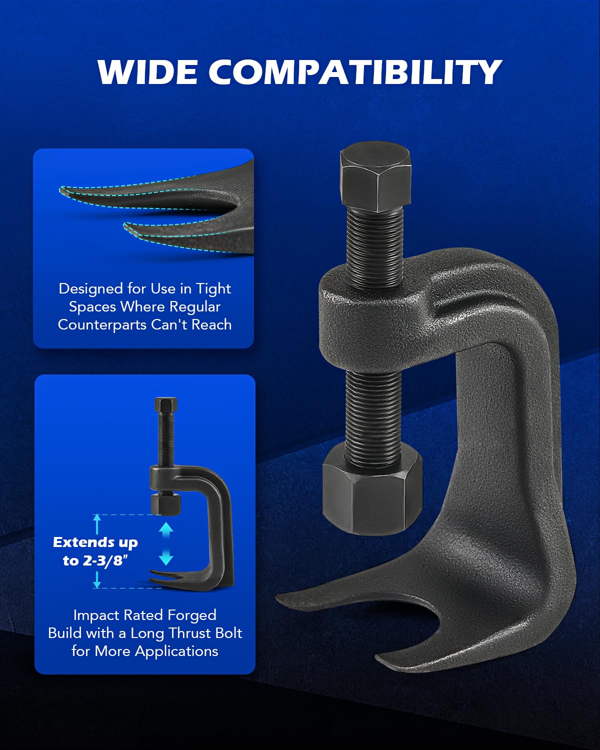 Description On The Hunt For The Ultimate Solution To Tackle Ball Joint Removal For Your Car, Suv, Or Hefty Truck? Orion Motor Tech'S Ball Joint Separator Is Here To Revolutionize Your Automotive Maintenance Experience! This Ball Joint Extractor Ensures A Seamless Operation With Its Assembly-Free Process, Allowing You To Effortlessly Handle Ball Joints Like Never Before. Engineered For Universal Compatibility, This Ball Joint Separator Features A Low Profile Design Tailored For Tight Access, Making It The Perfect Companion For A Variety Of Vehicles. Whether You'Re Working On Compact Cars, Robust Trucks, Or Spacious Suvs, Our Separator Accommodates Ball Joint Sizes Up To 2-3/8 In. (6 Cm), Providing Versatility For All Your Automotive Needs. This Handy Set Is Compatible With Your Beloved Ford, Lincoln, And Mercury With Ease! Specifications Material: Steel Separator Dimensions: 4.3 X 3.2 In. (110X80 Mm) Separator Drive: 3/4 In. (19 Mm) Hook Dimensions: 4.2 X 3.8 X 0.5 In. (105X95X12.5 Mm) Warranty: 1 Year Package List 1 X Thrust Bolt 1 X Thrust Bolt Nut 1 X C-Frame 1 X Hook 1 X Instructions