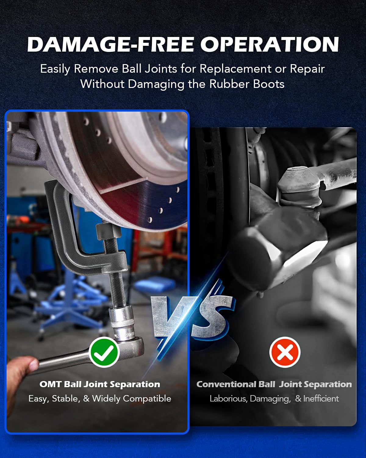 Q: How does the ball joint removal tool ensure safe removal without damage?A: This ball joint removal tool is engineered to facilitate quick and safe removal of ball joints without damaging the rubber boot, which is crucial for cases where the ball joint will be reused after repair. Its design allows for precise adjustments, minimizing the risk of damage during the removal process.