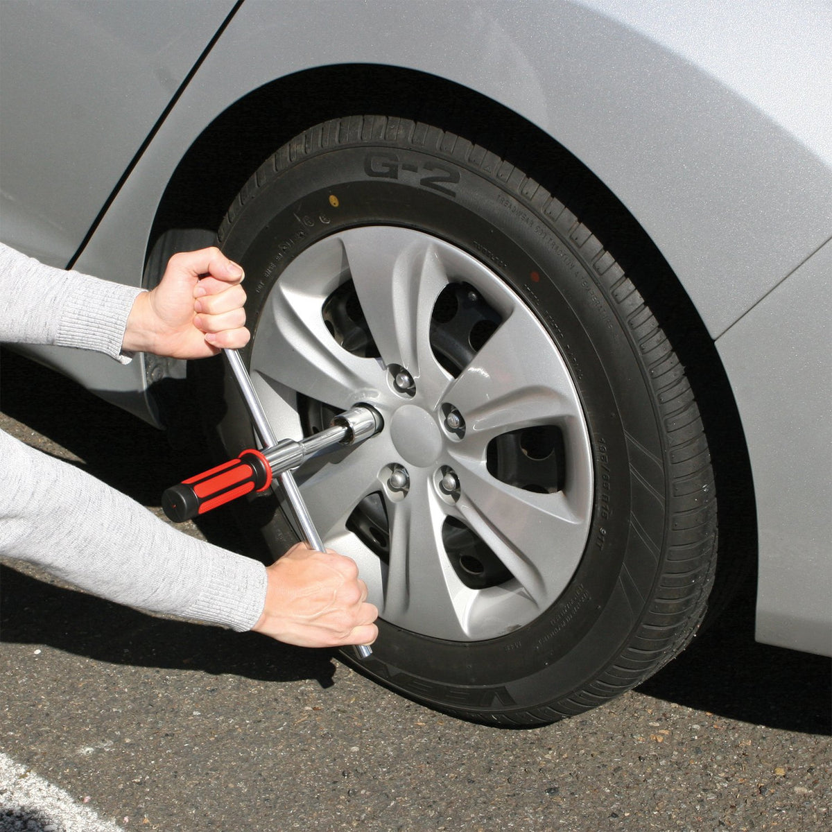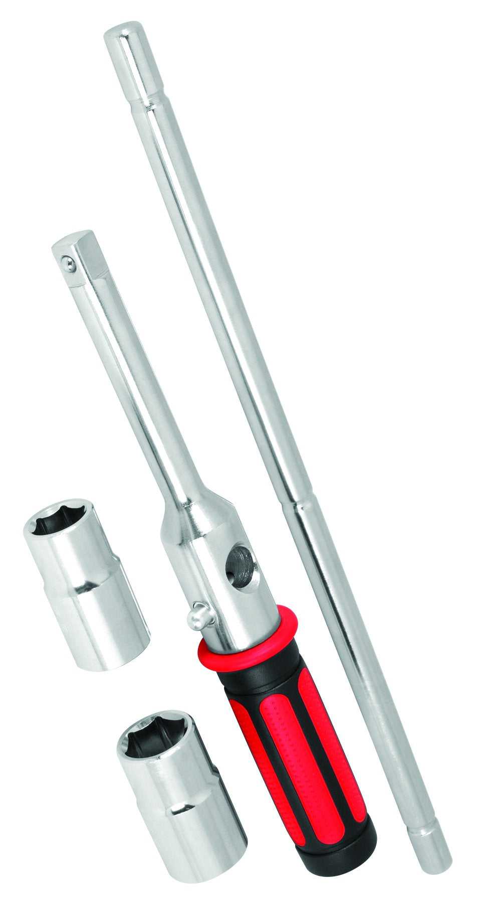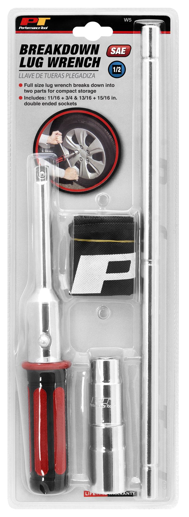 Performance Tool W5 SAE Breakdown Compact Lug Wrench (11/16, 3/4, 13/16 & 15/16''). Double ended socket Sizes: 11/16, 3/4, 13/16 & 15/16''. Wrench breaks down into two parts. Design allows For Easy Storage, suitable for your vehicle's roadside emergency kit. Heat treated steel for torque, strength, and durability. Store your tire wrench set in your spare tire compartment; Whether you're changing your own flat or helping someone else on the road, you'll be prepared for any emergency anytime. . Everything fits into a small, compact carrying bag which can be stored along with your spare tire Rust resistant chrome plated finish.. Universal for cars, light trucks, SUVs, RVs and vans