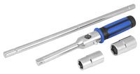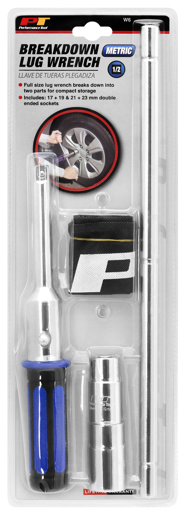 Performance Tool W6 Metric Compact Breakdown Lug Wrench (17, 19, 21 & 23Mm). Double Ended Socket Sizes: 17,19, 21 & 23Mm . Wrench Breaks Down Into Two Parts. Design Allows For Easy Storage, Suitable For Your Vehicle'S Roadside Emergency Kit. Heat Treated Steel For Torque, Strength, And Durability. Store Your Tire Wrench Set In Your Spare Tire Compartment; Whether You'Re Changing Your Own Flat Or Helping Someone Else On The Road, You'Ll Be Prepared For Any Emergency Anytime. . Everything Fits Into A Small, Compact Carrying Bag Which Can Be Stored Along With Your Spare Tire Rust Resistant Chrome Plated Finish.. Universal For Cars, Light Trucks, Suvs, Rvs And Vans