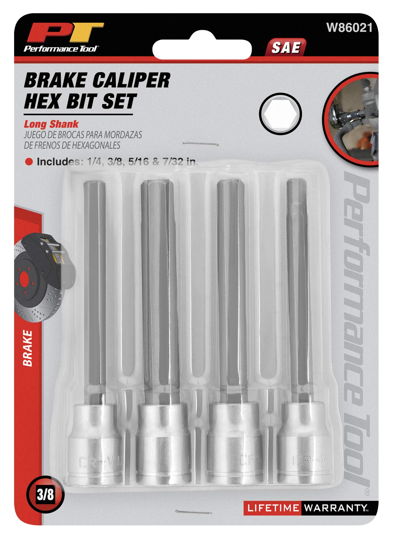 The Performance Tool Brake Caliper Socket Set Is A Versatile Tool Set That Includes Four Sae Sizes (1/4'', 3/8'', 5/16'', And 7/32'') To Fit A Variety Of Brake Caliper Bolts. Made Of Heat-Treated Alloy Steel For Superior Strength And Durability, This Set Features A Long Reach Design With A 4-Inch Overall Length That Allows For Easy Access To Hard-To-Reach Brake Caliper Bolts. The Professional Sand Finish Gives The Set A Sleek And Polished Look, Making It An Ideal Tool Set For Both Diyers And Professional Mechanics Who Need A Reliable Tool Set For Brake Caliper Maintenance And Repair.