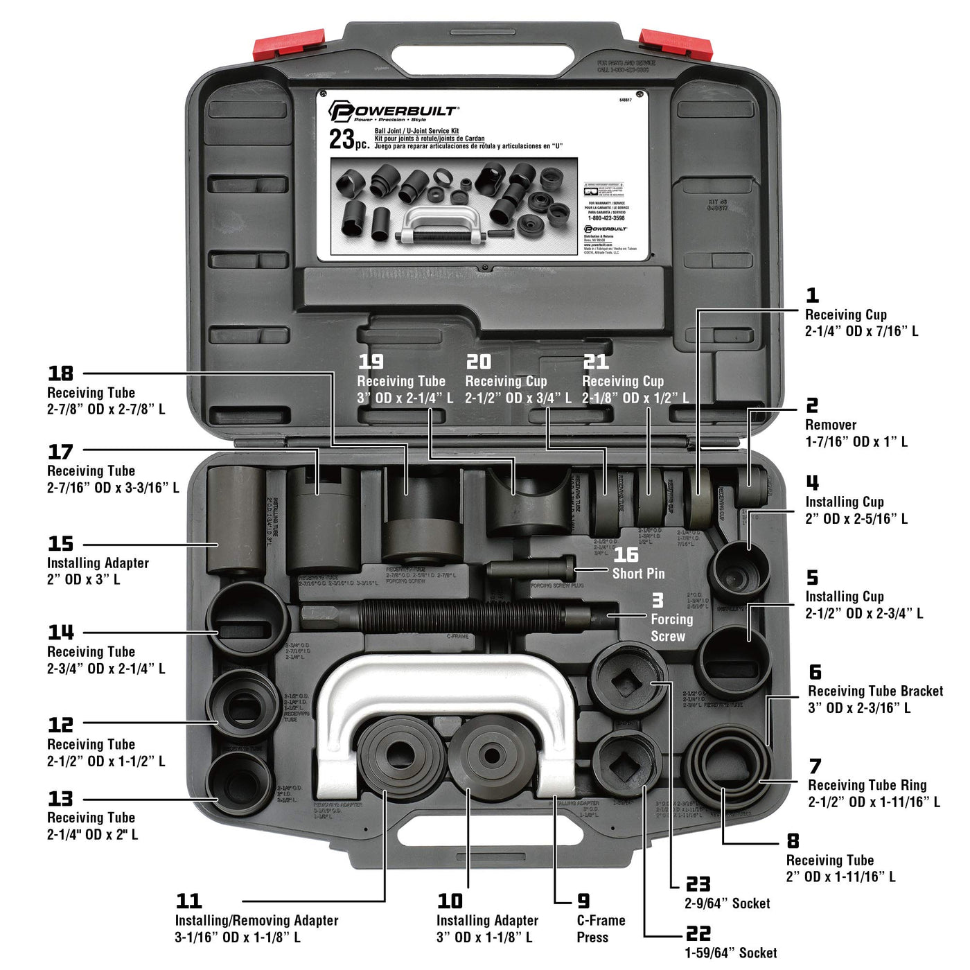 Product Descriptionlook No Further For A Perfect Tool Set To Install And Remove Vehicle Ball And U Joints. The Powerbuilt Ball Joint & U Joint Service Set Includes 23 Tools Perfect For Working With Pressed-In Type Ball Joints Found On Most Vehicles. It Saves You Work By Letting You Change Ball Joints Without Removing Control Arm From The Vehicle. This Set Includes Receiving And Installing Tubes, Cups, And Adapters, And All The Accessories You'Ll Need To Get The Job Done. Carry Case Includes Usage Photos And Instructions. Meets Or Exceeds Ansi Standards. This Set Includes: - Plug:Od 7/8'' - Receiving Tube: Od 2-1/4'' Id 2'', 2''- Installing Tube: Od 2'' Id 1-3/4'', 3'' - Receiving Tube: Od 2-1/2'' Id: 2-1/4'', 1-1/2'' - Receiving Cup: Od 2 -1/4'' Id 1-7/8'', 7/16'' - Receiving Tube: Od 2 1/2'', 2-1/4'', 3/4'' - Receiving Tube: Od 2-7/16'' Id 2-3/16'', 3-3/16'' - Remover/Installer: Od 1-7/16'' Id 3/4'', 1'' - Installing Tube: Od 2'' Id 1-3/4'', 2-5/16'' - Receiving Cup: Od 2-1/8 Id 1-3/4'', 1/2'' - Receiving Tube: Od 2-1/2'' Id 2-1/4'', 2-3/4'' - Receiving Tube: Od 3'' Id 2-3/4'', 2-1/4'' - Receiving Tube: Od 2-3/4'', Id 2-7/16'', 2-1/4''- Receiving Tube: Od 2-7/8'' Id 2-5/8'', 2-7/8'' - Screw -C-Frame - Receiving Tube: 1-3/4'' X 2'' - Receiving Tube: 2-1/4'' X 2-1/2'' - Receiving Tube: 2-3/4'' X 3'' - Removal Adapter - Install Adapter 3/4''Dr. X 1-59/64'' - Install Adapter 3/4''Dr. X 2-9/64''- Blow Molded Case -Removes And Installs Pressed-In Type Ball Joints Found On Most Vehicles -Changes Ball Joint Without Removing Control Arm From The Vehicle -Tools Can Also Be Used To Remove And Install U Joints -Carry Case Includes Usage Photos And Instructions -Meets Or Exceeds Ansi Standardsfrom The Manufacturereach Kit Includes Step-By-Step Usage Instructions And Photos Showing The Tool In Use. Instruction Sheets Are Laminated To Resist Staining And Are Permanently Fastened To The Case. All Instructions Are Developed By A Professional Repair Manual Writer. Kit 46 Tools Are For Removing And Installing Most Sizes Of Press-Fit Ball Joints. Allows Change Out Of Ball Joint Without Removal Of The Control Arm. These Tools Can Also Be Used To Remove And Replace U-Joints. The Set Includes - 1 Pc - Plug: O.D. 7/8'' 1 Pc - Receiving Tube: Od: 2-1/4'', Id:2'', 2''(L) 1 Pc - Installing Tube: Od: 2'', Id: 1-3/4'', 3''(L) 1 Pc - Receiving Tube: Od: 2-1/2'', Id: 2-1/4'', 1-1/2'' (L) 1 Pc - Receiving Cup: Od:2 -1/4'', Id: 1-7/8'', 7/16'' (L) 1 Pc - Receiving Tube: Od:2 1/2'', Od: 2-1/4'', 3/4'' (L) 1 Pc - Receiving Tube: Od:2-7/16'', I.D:2-3/16'', 3-3/16''(L) 1 Pc - Remover/Installer: Od:1-7/16'', I.D:3/4'', 1'' (L) 1 Pc - Installing Tube: Od: 2'', Id: 1-3/4'', 2-5/16'' (L) 1 Pc - Receiving Cup: Od: 2-1/8:, Id: 1-3/4'', 1/2'' (L) 1 Pc - Receiving Tube: Od: 2-1/2'', Id: 2-1/4'', 2-3/4'' (L) 1 Pc - Receiving Tube: O.D.: 3'', Id: 2-3/4'', 2-1/4'' (L) 1 Pc - Receiving Tube: O.D.: 2-3/4'', Id: 2-7/16'', 2-1/4''(L) 1 Pc - Receiving Tube: Od: 2-7/8'', Id: 2-5/8'', 2-7/8'' (L) 1 Pc - Screw 1 Pc - C-Frame 1 Pc - Receiving Tube: 1-3/4'' X 2'' 1 Pc - Receiving Tube: 2-1/4'' X 2-1/2'' 1 Pc - Receiving Tube: 2-3/4'' X 3'' 1 Pc - Removal Adapter 1 Pc - Install Adapter 1 Pc - 3/4''Dr. X 1-59/64''. 2''(L) 1 Pc - 3/4''Dr. X 2-9/64''. 2''(L) 1 Pc - Blow Molde Case