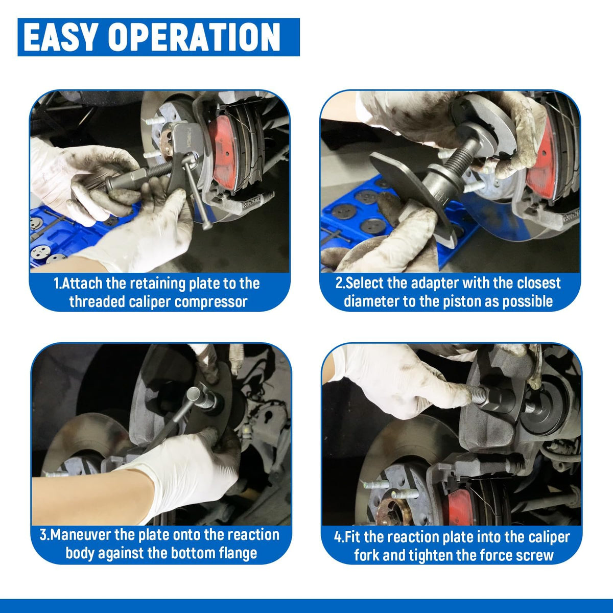 Effortless Brake Maintenance: Simplify Brake Pad And Shoe Replacement With This Brake Caliper Compression Tool, Suitable For Cars, Trucks, And 4-Wheel Drive Disc Brake Vehicles. The Kit Includes Both Right-Handed And Left-Handed Thrust Bolt Assemblies For User Convenience. Versatile Compatibility: Boasting Universal Compatibility With 18 Adapters, This Brake Caliper Tool Fits A Wide Range Of Vehicle Makes And Models, Including American, European, And Japanese Brands. Refer To The Detailed Product Description For A Complete List Of Compatible Vehicles. Robust Construction: Crafted From Durable Carbon Steel With A Rust-Proof Blasted Finish, These Caliper Piston Compressor Tool Offer Heavy-Duty Durability, Ensuring Resilience Against Frequent Use And Accidental Drops. Suitable For Diy Enthusiasts And Professional Mechanics Alike. Handy Carrying Case: The Disc Brake Caliper Tool Set Comes In An Abs Carrying Case Featuring Pre-Sized Slots For Each Component, Including Right And Left-Handed Thrust Bolts, 2 Retaining Plates, And 18 Disc Adapters. Keep Your Tools Organized And Easily Accessible.