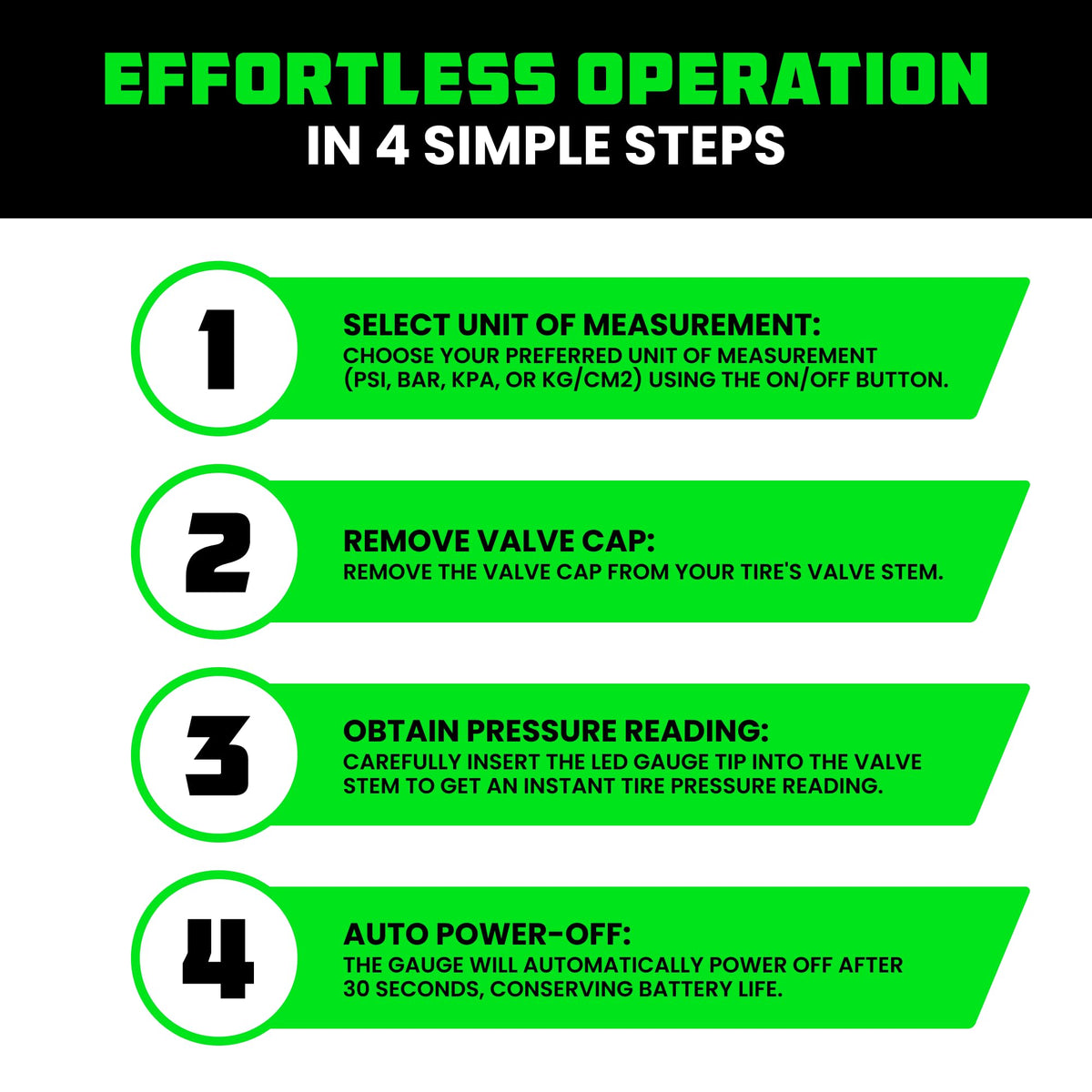 Q: What are the key features of the Rhino USA Digital Tire Pressure Gauge?A: The Rhino USA Digital Tire Pressure Gauge features an ergonomic design, a lighted nozzle, an LCD backlit display, and certified accuracy in four measurement ranges: PSI, BAR, KPA, and Kg/cm2. It is easy to use both day and night, making it an ideal tool for tire maintenance.