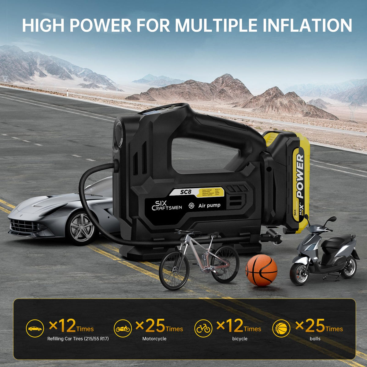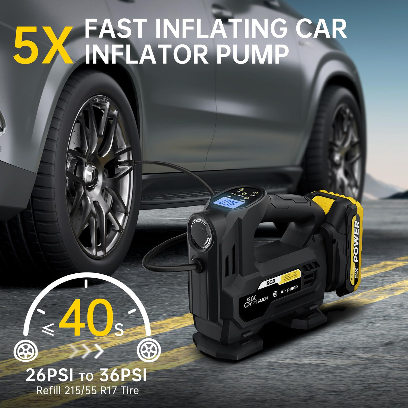 Six Craftsmen Tire Inflator Portable Air Compressor, 20V Cordless Car Tire Pump with LED Light&Gauge, 150PSI Automotive Car Acce